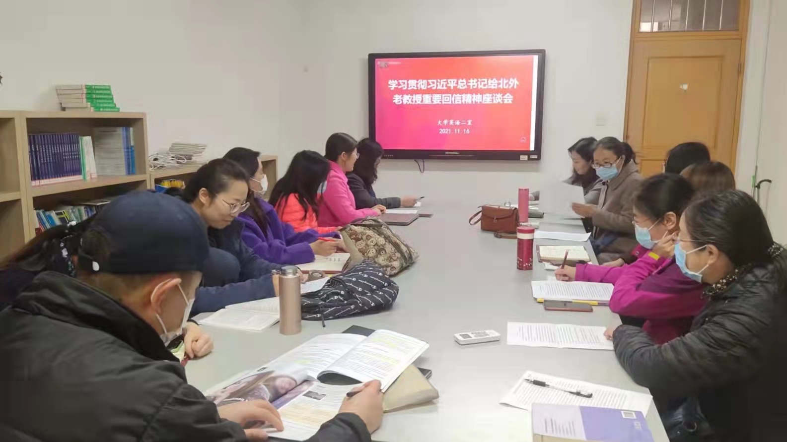 11月16日,永利集团官网入口大学英语二室于文经楼B203召开了习近平总书记给北外老教授回信精神学习交流会。会议由教研室主任聂庆娟老师主持,主要交流学习习近平总书记给北外老教授们回信的心得体会和自我反思,教学工作反思重点围绕教研室集中开展的课程思政教学展开,也明确了下一步课程思政教学努力的方向。大学英语二室全体教师参加了会议。