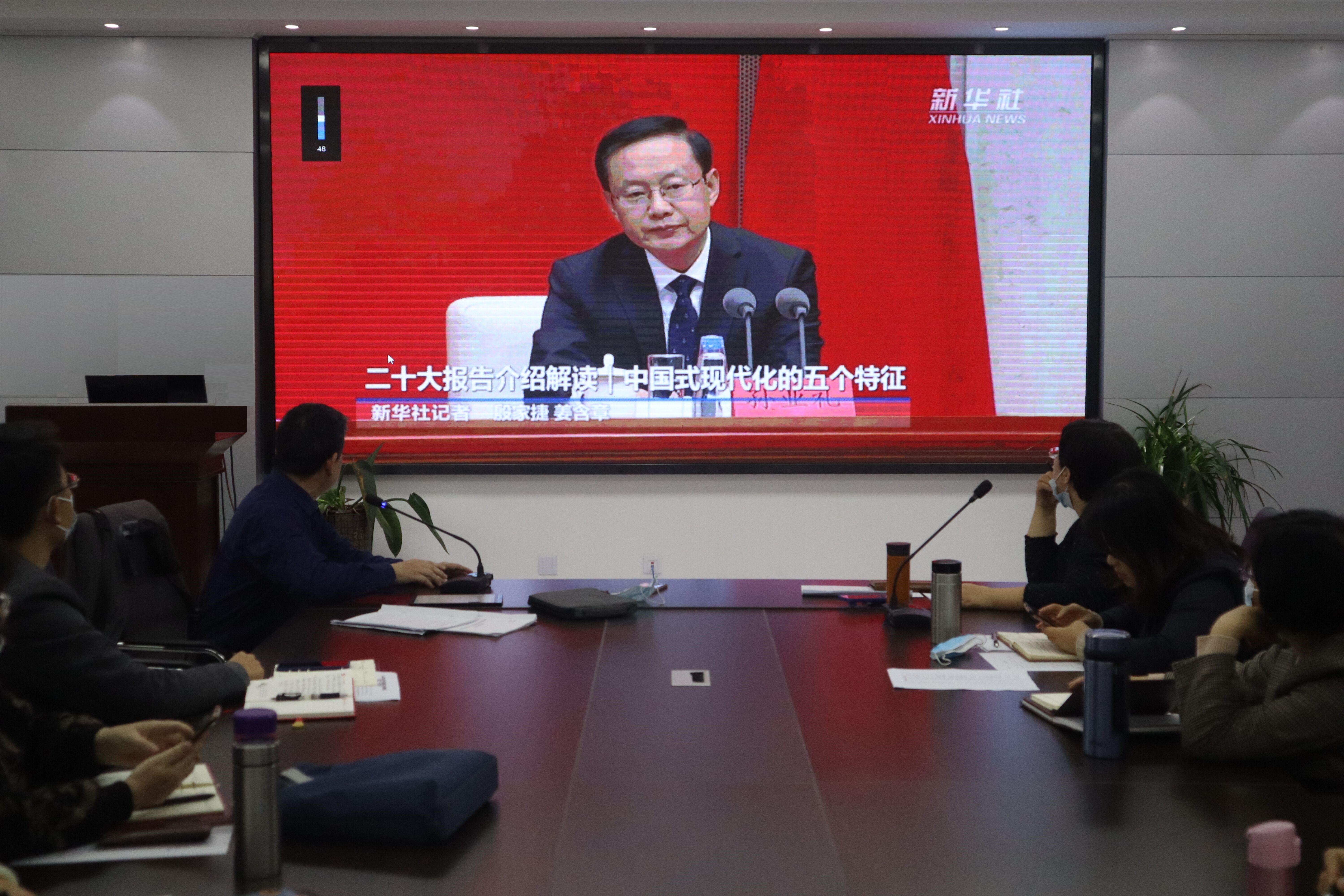 在前期学院组织教职工认真学习党的二十大报告的基础上,全体教师集体观看了10月24日中共中央新闻发布会解读党的二十大报告的相关视频,认真学习了中央政策研究室主任江金权、中央宣传部副部长孙业礼等有关方面负责人对于党的二十大报告内容的解读,进一步深化了大家对于党的二十大报告内容的理解和把握。