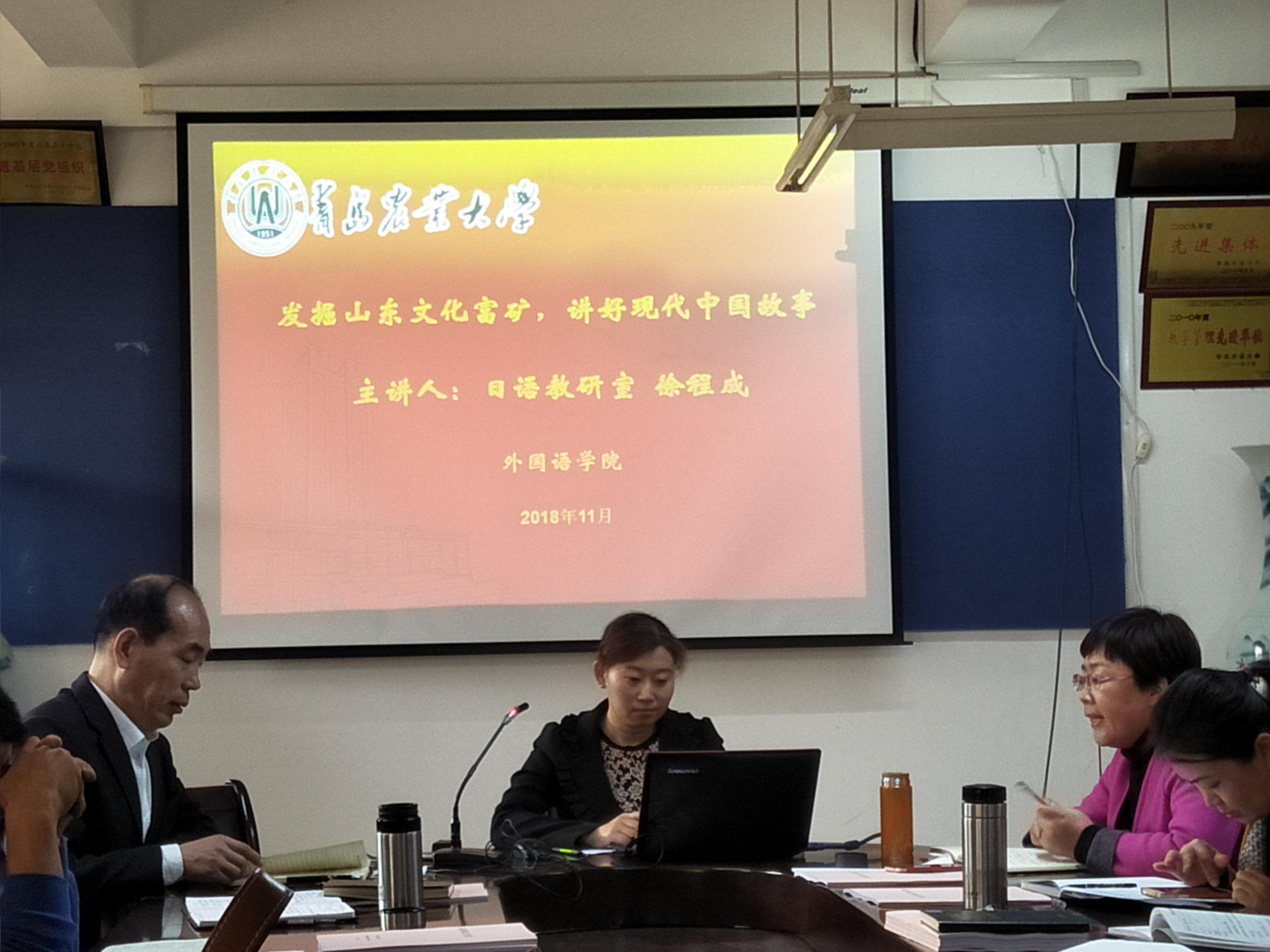 会上,按照学院教职工政治理论学习安排,日语教研室教师徐程成做了题为“发掘山东文化富矿,讲好现代中国故事”的学习交流发言。她认为,弘扬齐鲁大地的优秀传统文化,要立足于外语专业教育教学工作实际,以语言作为文化载体,在教学科研和对外交流中传播山东文化,彰显齐鲁风范,讲好中国故事,展现中国气派。要在工作中挖掘和整合山东丰富的文化资源,特别是要在与国外文化交流融合的过程中,既要做到开放包容、相互取长补短,又要做到扎根本土,坚定文化自信。