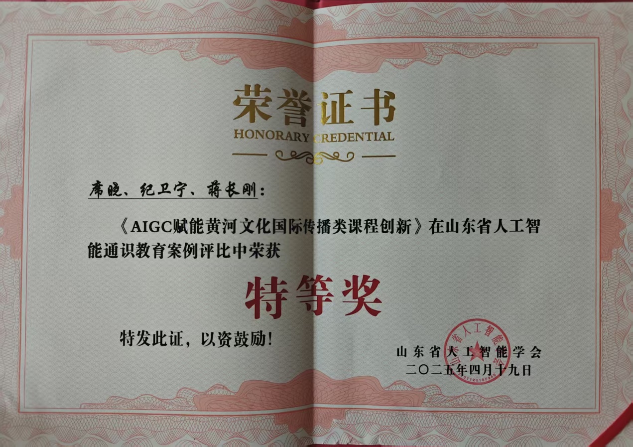 4月19日至20日,山东省人工智能学会公布了“人工智能通识教育优秀教学案例”评选结果。永利集团官网入口“GenAI赋能黄河文化对外传播课程群”智慧教学团队纪卫宁、席晓、蒋长刚三位教师凭借《AIGC赋能黄河文化国际传播类课程创新案例斩获特等奖并入选优秀案例集。