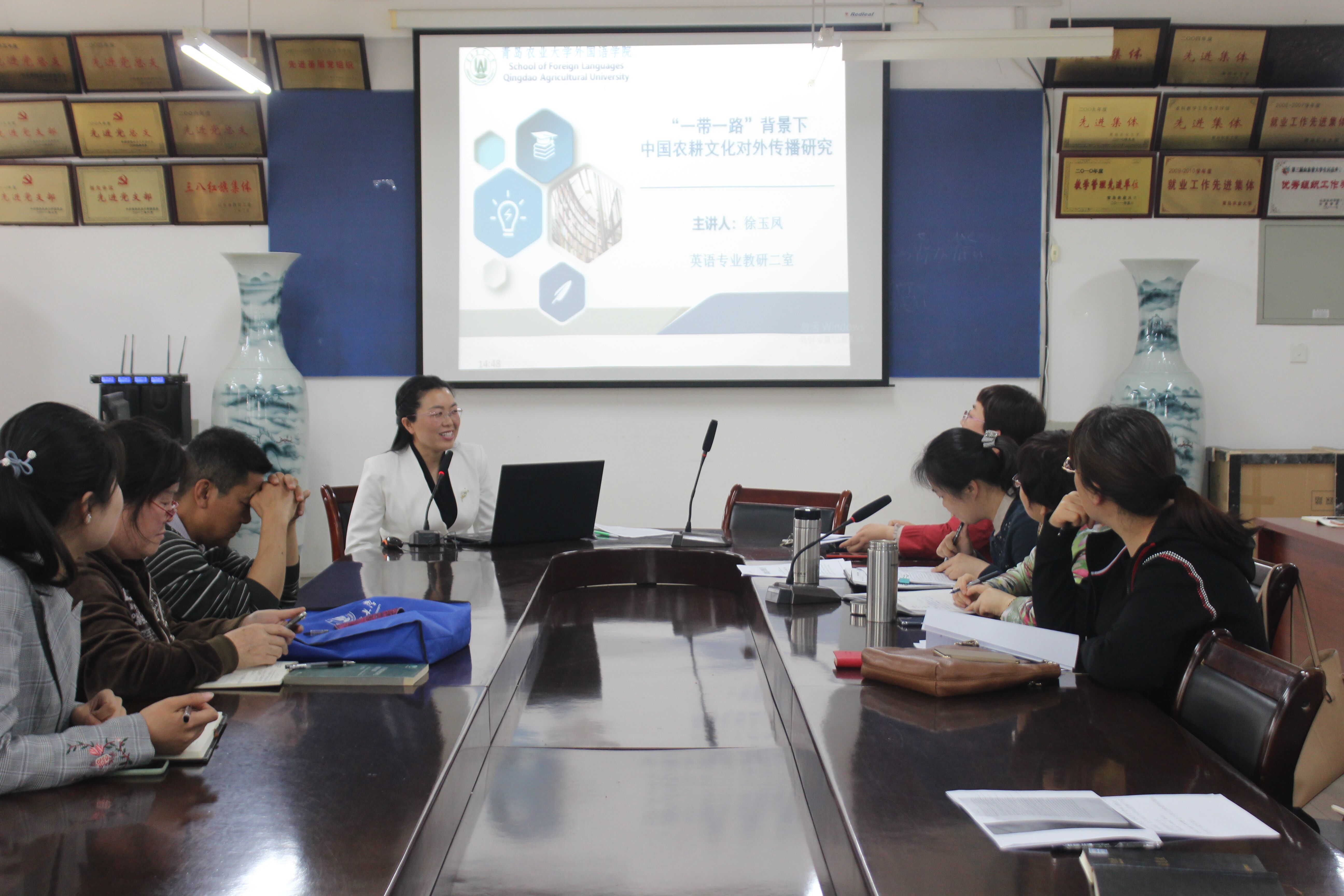 5月9日,永利集团官网入口于文经楼会议室开展外语学术论坛第三讲。此次学术论坛由徐玉凤博士主讲,主讲题目为《“一带一路”背景下中国农耕文化对外传播研究》,学院全体领导、教职工与会,副院长高秀雪主持论坛。