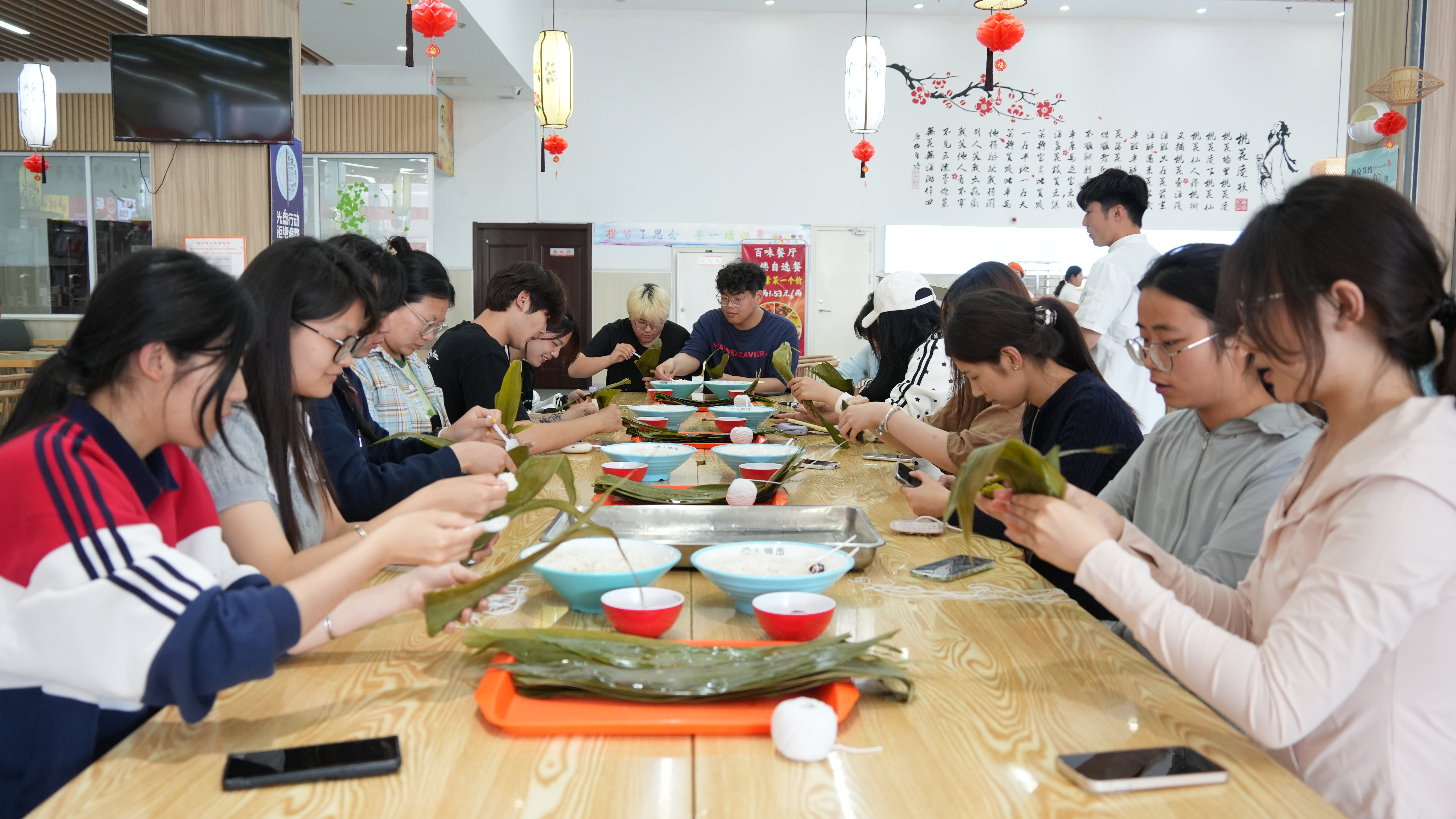 活动现场,专业厨师耐心细致地为学生讲解包粽子的技巧,从食材的精心准备,到粽叶的仔细清洗,再到包制与捆绑,每一个步骤都讲解得详尽入微、一丝不苟。学生们以班级为单位,分成若干小组,协作完成包粽子任务。