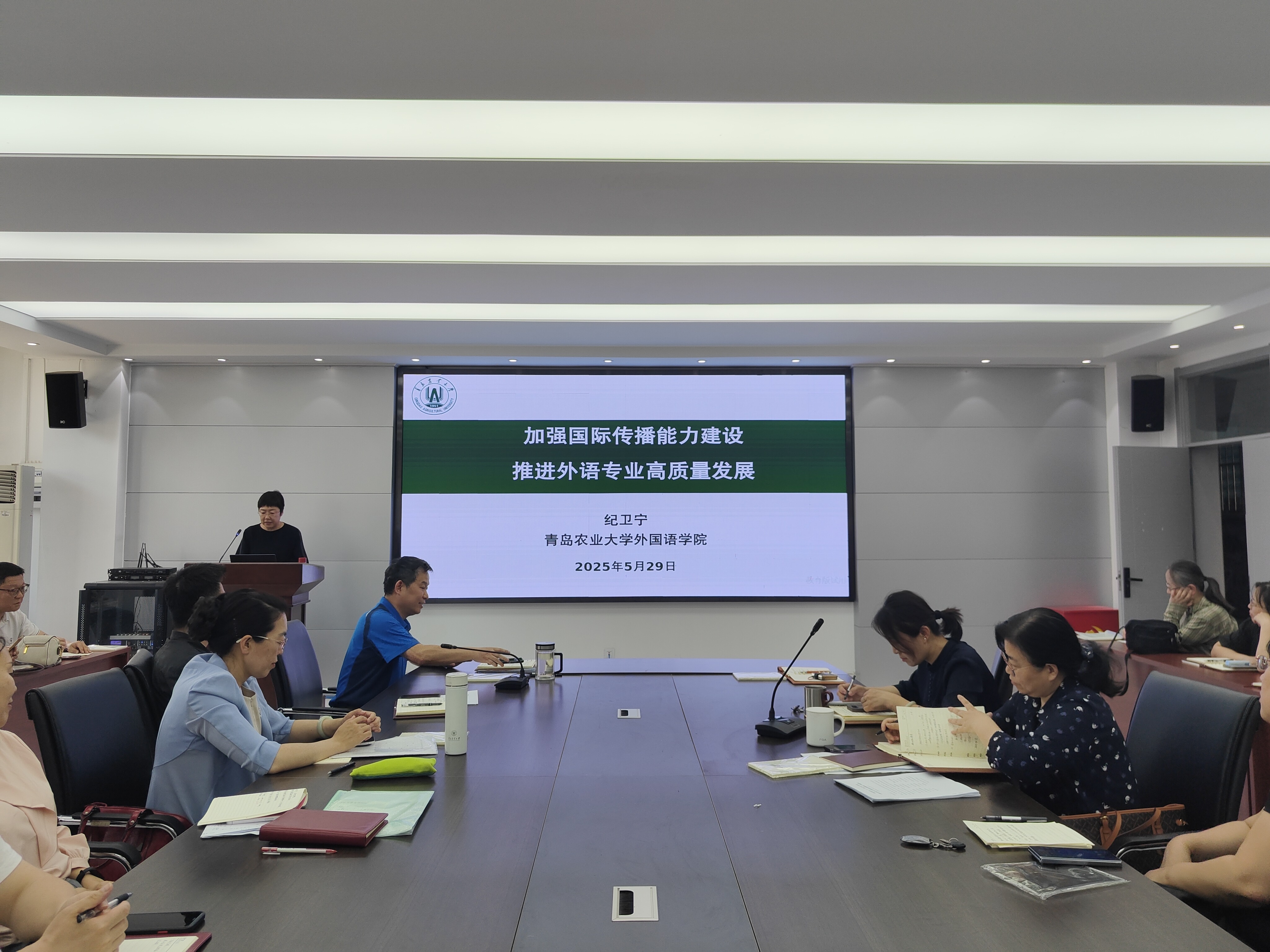 纪卫宁以《加强国际传播能力建设,推进外语专业高质量发展》为题讲授专题党课,分别就外语专业面临的挑战与困难、如何破局两个方面深入剖析了当前外语专业发展面临的严峻挑战与重大机遇,并提出了以服务国家国际传播能力建设为核心,推动外语专业高质量发展的三点破局思路。一是要稳住神,强调在面对挑战时必须保持稳定的心态,坚定发展信心。二是要保专业,学院需要明确短期生存与长期发展的目标,核心是通过提升实际业绩确保专业的持续发展。三是要促改革,推动外语专业的全面改革,通过创新培养模式、教学内容和教师队伍建设,提升教育质量和国际竞争力。