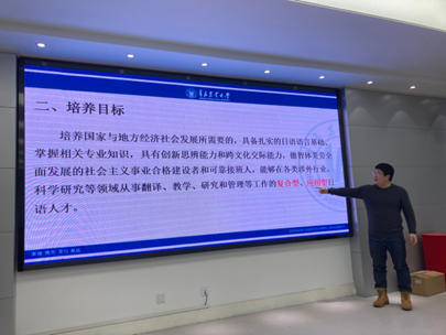 日语系副主任王健从专业简介、培养目标、培养过程、师资队伍、教学条件与资源、学生发展、质量保障、专业特色与发展规划八个方面对日语专业进行了专业汇报。