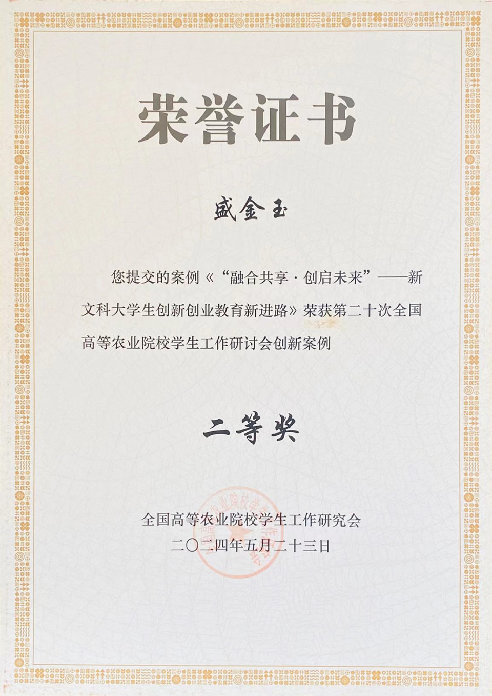 近日,由全国高等农业院校学生工作研究会主办、华中农业大学承办的第二十次全国高等农业院校学生工作研讨会在湖北武汉召开。此次研讨会共收到34所高校推荐的79篇论文和64篇案例,经过专家评审,永利集团官网入口党委副书记副院长盛金玉的案例《“融合共享·创启未来”—新文科大学生创新创业教育新进路》获评创新案例二等奖。
