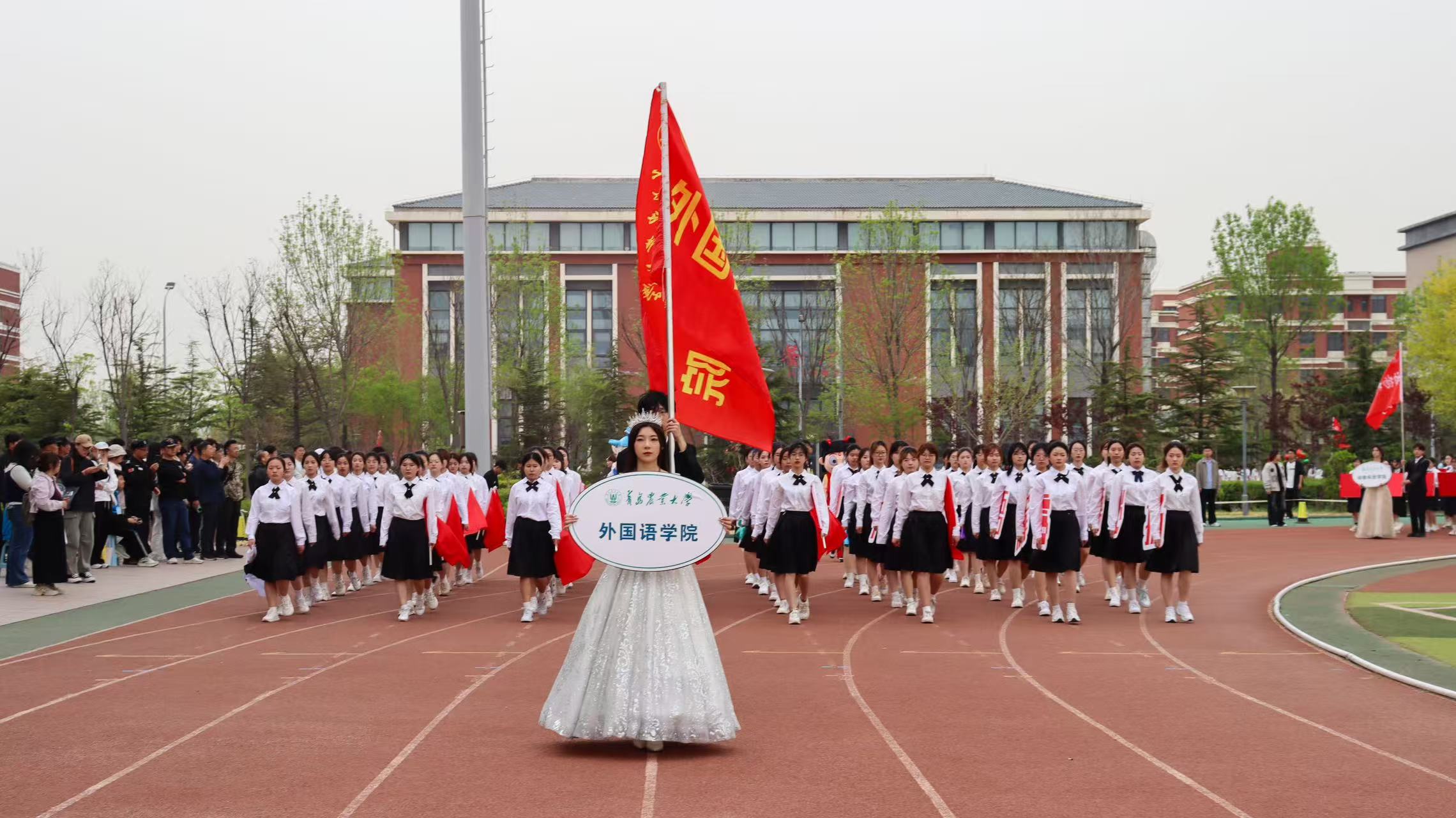 永利集团官网入口“虹子初心”代表方队在开幕式中大放异彩,彩带飘扬,红旗跃动,青春与梦想交织。象征着“虹文化”的七色彩带穿梭飞扬,好似青春的调色盘,绘出绚烂多彩的画卷,寓意着永利集团官网入口学生们丰富多彩的校园生活与无限可能的未来。舞动的红旗,映着青春的面庞,展现出当代大学生的拳拳爱国心,彰显着他们对祖国的深深热爱与崇高敬意。列队学生代表身穿黑白相间学院风制服,精神抖擞、步伐整齐、口号嘹亮,斗志昂扬,充分展示了新时代外语人的自信与激情。