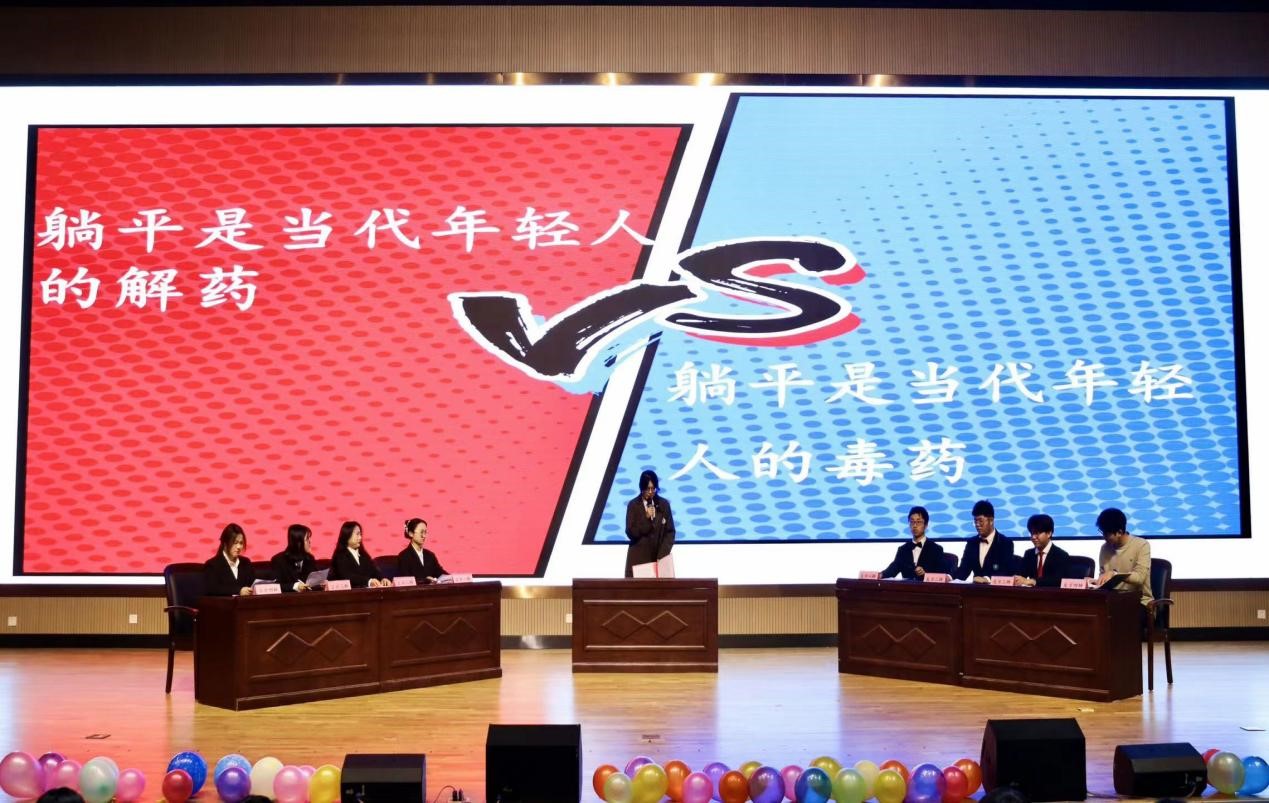 这次辩论赛本着“重在参与,公平竞赛”的原则,采取四对四团体辩论制,辩题为:“躺平是当代年轻人的解药(正方)还是毒药(反方)”。双方辩手才思敏捷、语若利剑,为观众带来了精彩的辩论。张钰扬、胡勋涛就上场礼仪问题、辩论技巧等方面进行了点评,渠非、邱文超、盖越帅围绕辩手安排、辩题剖析、辩论语气与态度等进行了指导。