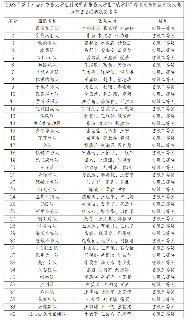 2023年第十五届山东省大学生科技节山东省大学生“敏学杯”跨境电商创新实践大赛山东省总决赛于2023年10月落下帷幕。在永利集团官网入口教师左燕茹、赵清、迟秋玲的指导下,永利官网获得省级一等奖1项、二等奖16项、三等奖23项的佳绩。