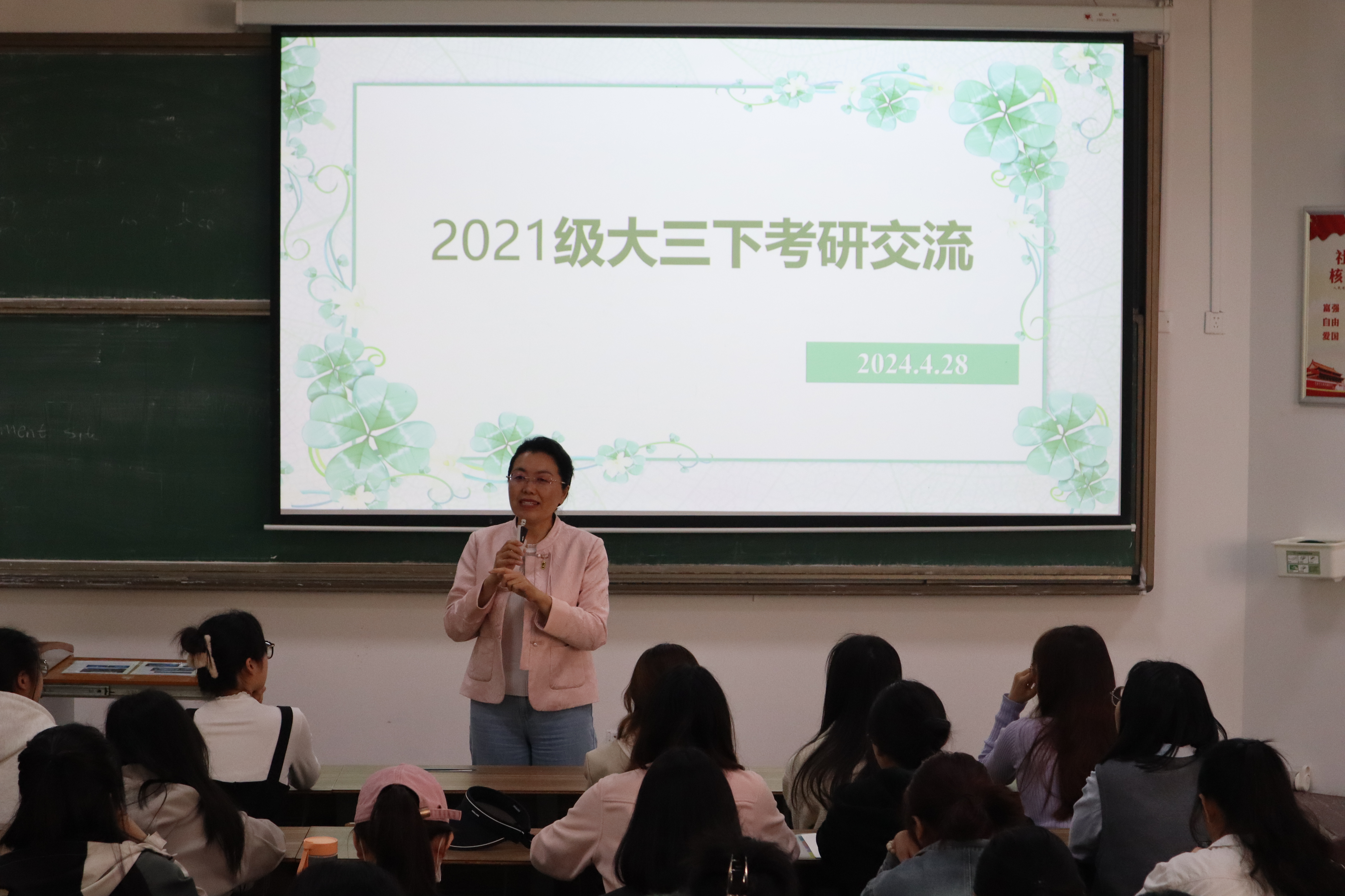 徐玉凤结合2024年学院考研录取情况鼓励同学们勇敢报考,并对报考学校选择提出建议,鼓励同学们认真备战考研,合理制定学习规划。左燕茹介绍了英语专业学生的相关考研专业及适宜跨考专业,强调要通过学习兴趣和职业规划两个方面选择适合自己的院校和专业,勉励同学们在考研道路上放平心态,坚持到最后。