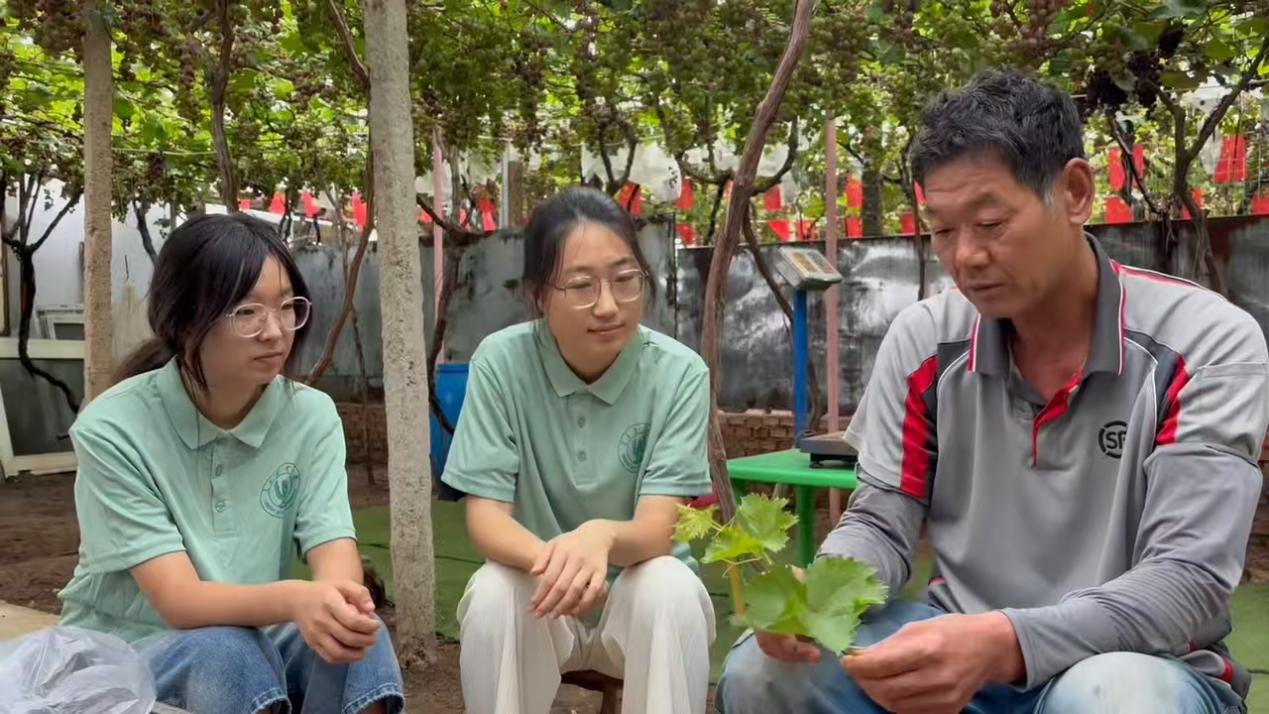 师生们第一站走进董安仁葡萄园,拜访了与葡萄相伴三十载的老农董大叔。那双布满老茧、沾满泥土的手,记录着亩产1500斤的秘诀。访谈过程中,董大叔道出了葡萄生长的关键——“温度经”,蕴含着农耕文明与自然和谐共生的智慧,是千百年“靠天吃饭”提炼出的生态哲学。团队成员们俯身田间,体验疏果、采摘的精细农活。这“沾满泥土”的课堂,让成员们深切体悟到“粒粒皆辛苦”的真谛与农耕技艺背后沉甸甸的匠心,思想深度在躬身实践中悄然提升。