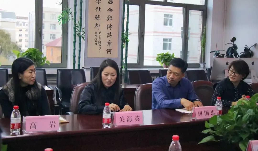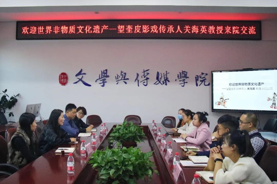 10月29日下午,Beat365中文官方网站举办望奎皮影戏专题座谈,关海英教授应邀莅临Beat365官网,学院党总支书记唐国忠、院长高岩、党总支副书记赵林楠、各年级辅导员及师生代表参加座谈。