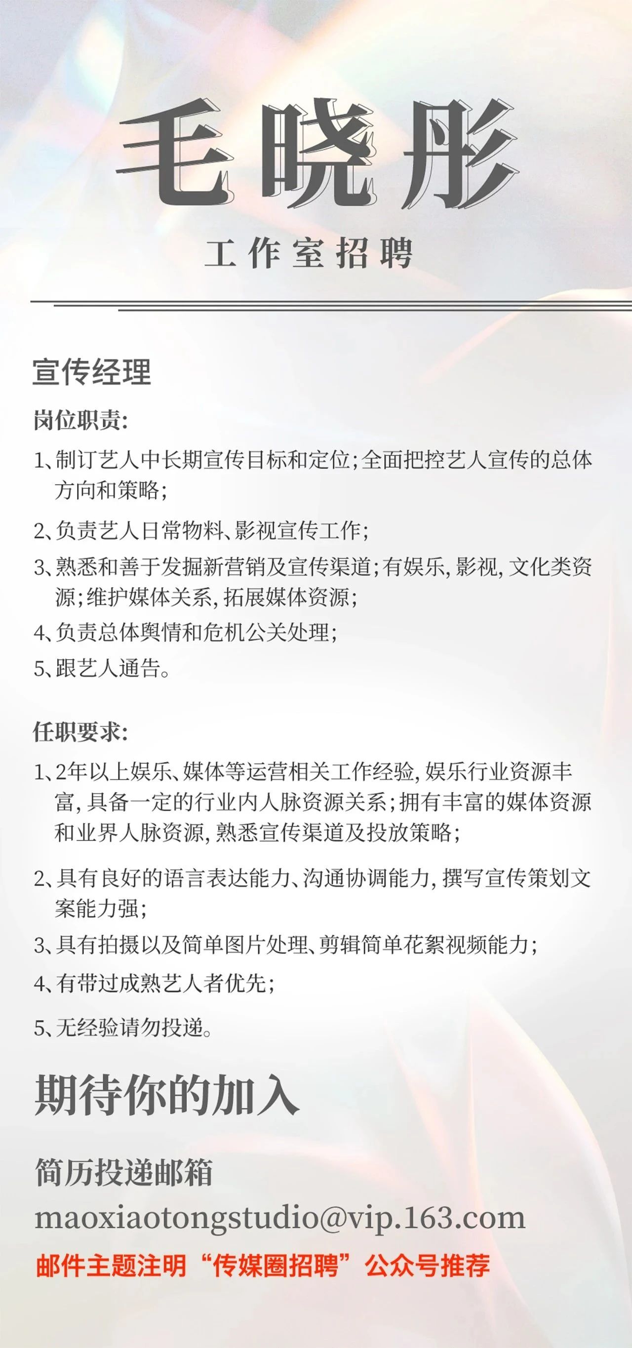 就业指导丨毛晓彤工作室招聘宣传经理!