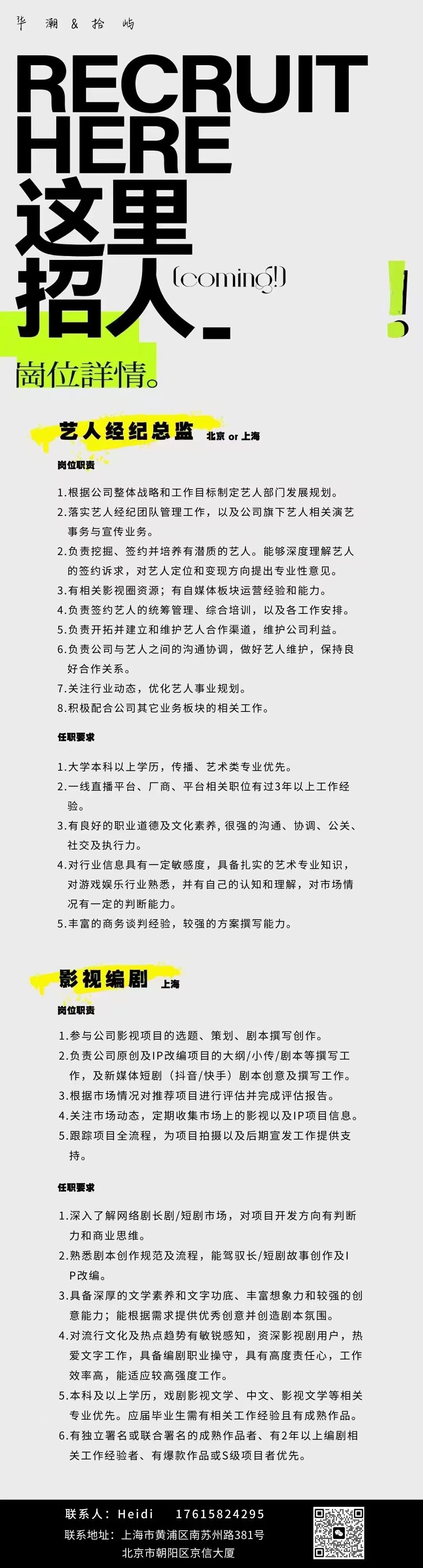 就业指导丨华潮&拾屿招聘艺人经纪总监、影视编剧