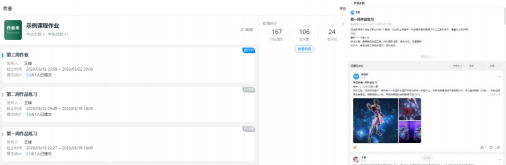 王璨老师课后通过调查问卷分析总结本次在线社群教学实践,首先在线教学圈为学生营造高效的自学空间及共享知识平台,通过互相提问、作业分享、生活动态的发布,师生之间随时随地保持人际弱关系,让老师与学生关系更为密切;其次,消弭学习过程中的孤独感,让社交和学习有机融合,教学圈子和钉钉群可以发布学生的学习成果,也能随时互动解答问题,同时生活化的话题和氛围也让学生们虽然身在异地但能够体验到共同学习进步的乐趣。再次,教学圈未来可以成为线下教学得补充,回归线下后实现线上线下的混合式教学,让学习随时在线,此外还可以进行横向与纵向扩展,横向上引入班级外的共同兴趣学习者,对接行业项目,让圈子不仅是课程学习圈也是技能展示圈,纵向上教学圈关联多个年级多个班级,可以多个学期重复使用,形成以课程和技能为中心的跨年级学习圈。