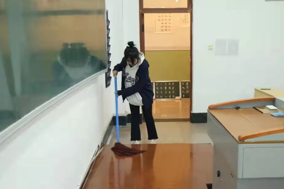 学生党员们对学院所有的教室进行了清扫,对教室的桌椅、物品进行了整理,所有学生党员一丝不苟、兢兢业业,经过近一个小时的辛苦劳动,将学院3个大教室和7个小教室打扫干净。