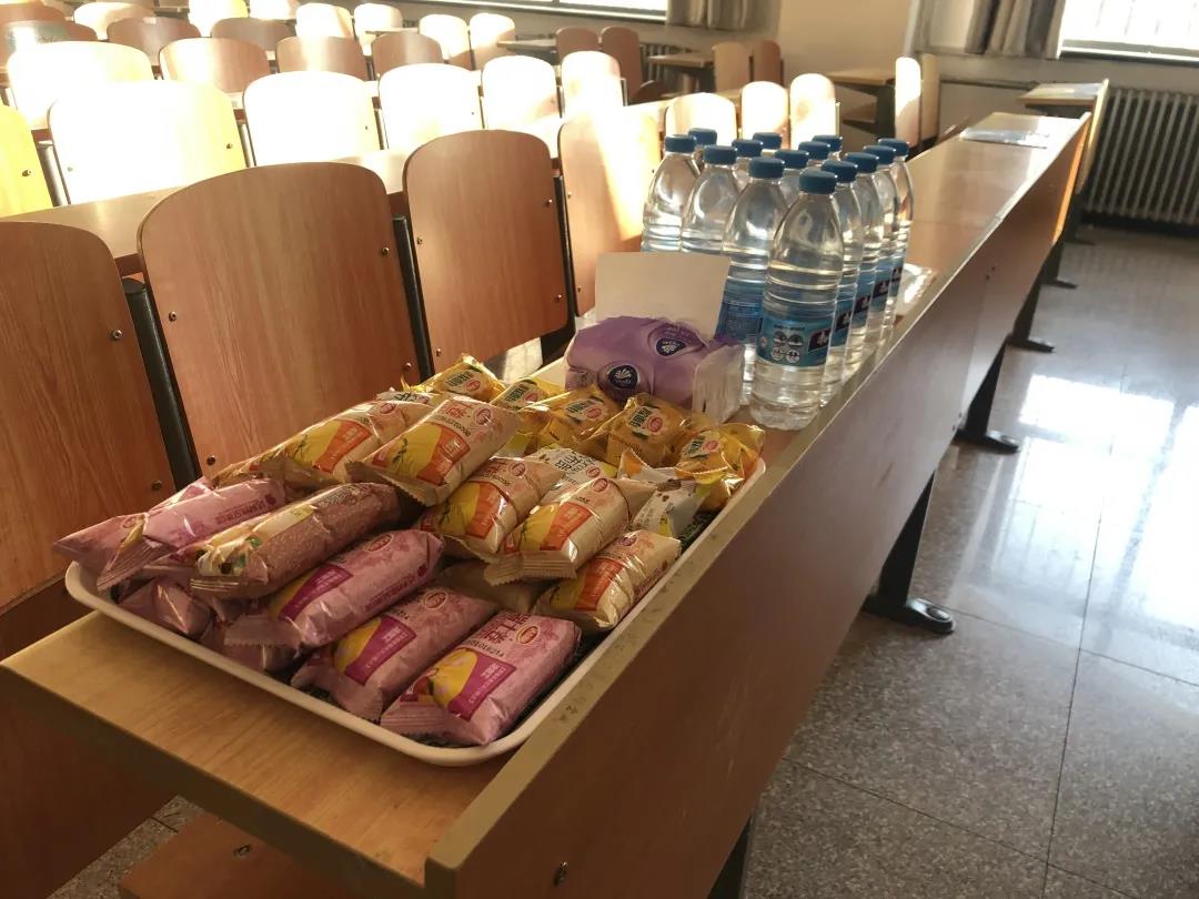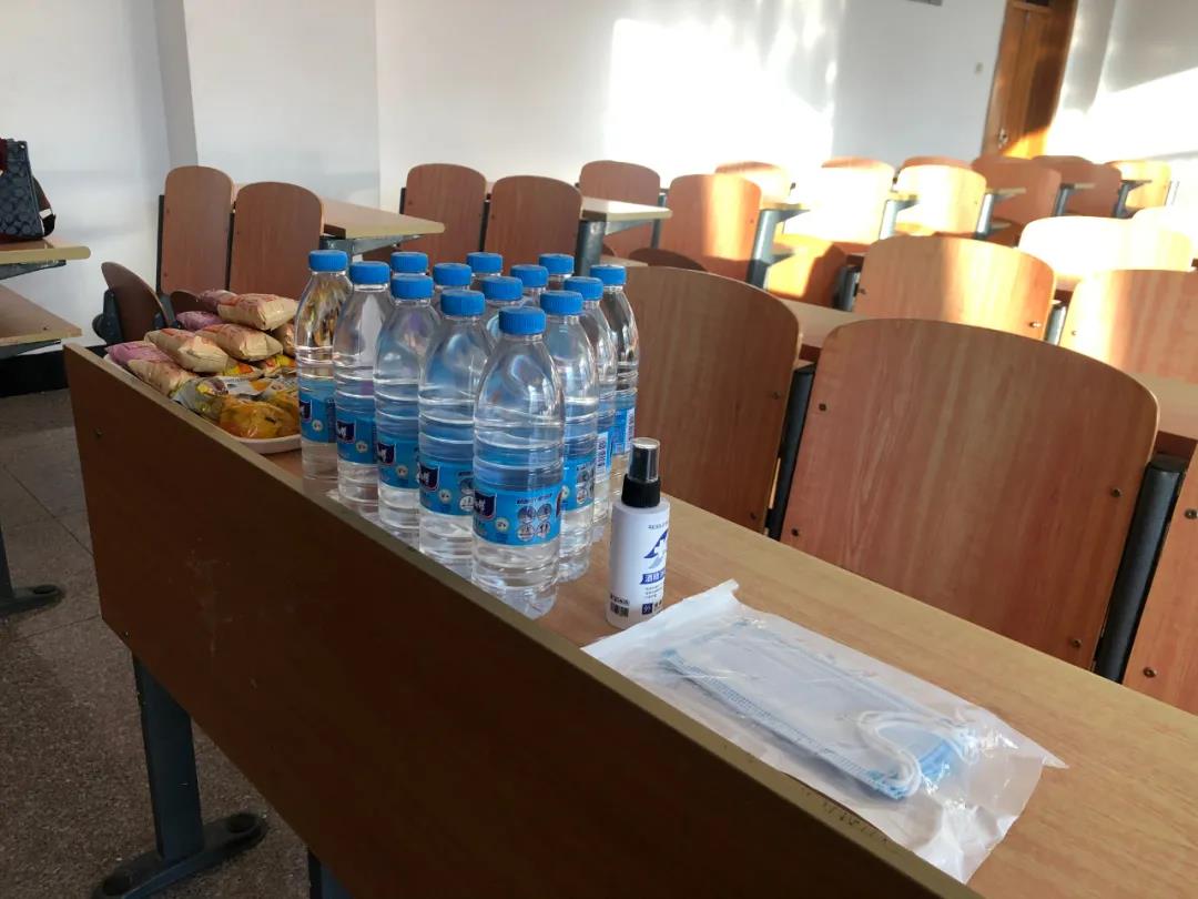 干净的课桌,明亮的教室,以及学院的领导老师和志愿者们为在隔离区等待的学子们准备了面包、纸巾和矿泉水等实用物品,让刚离家不久的学子们感受到家的温暖。