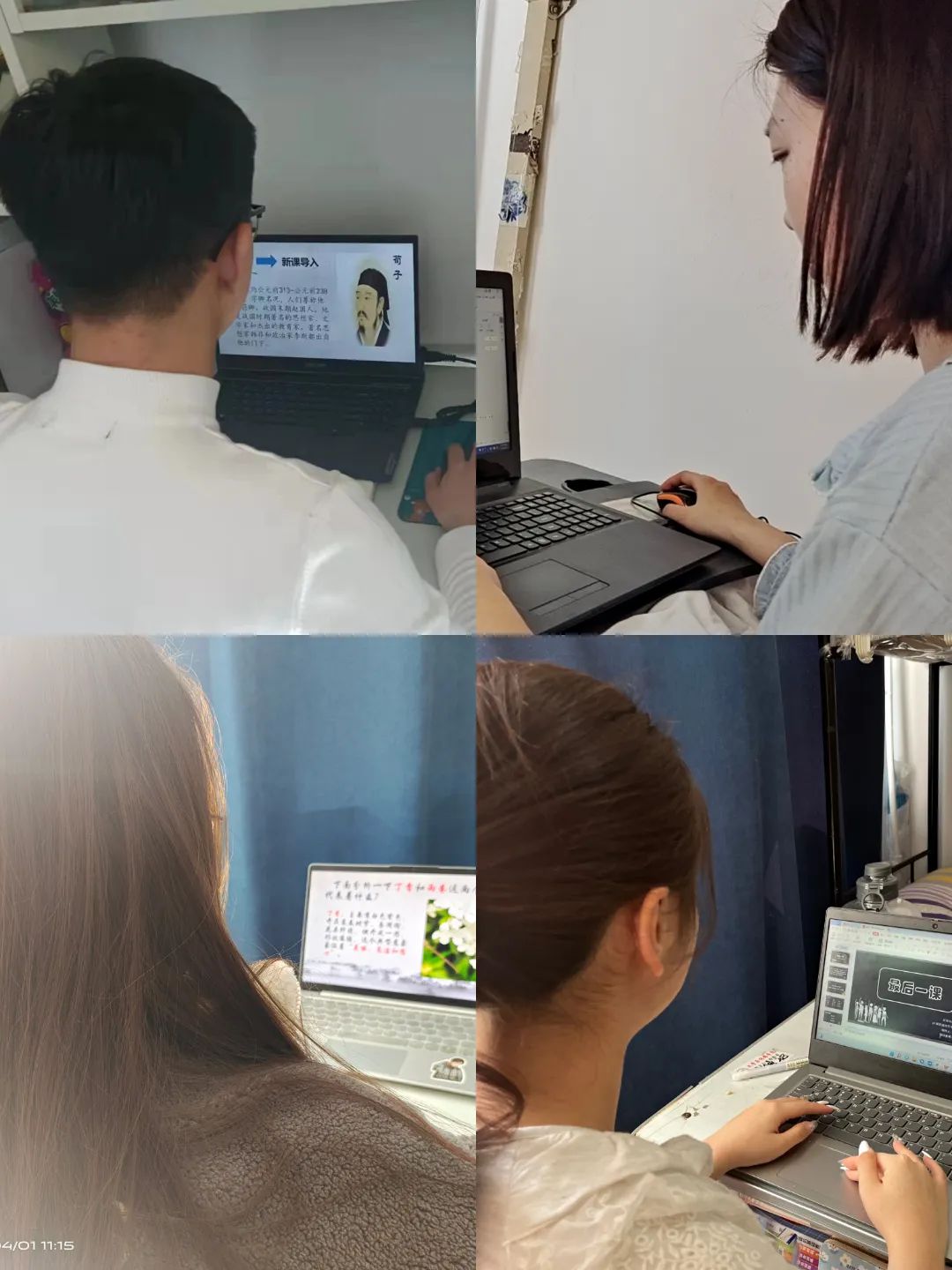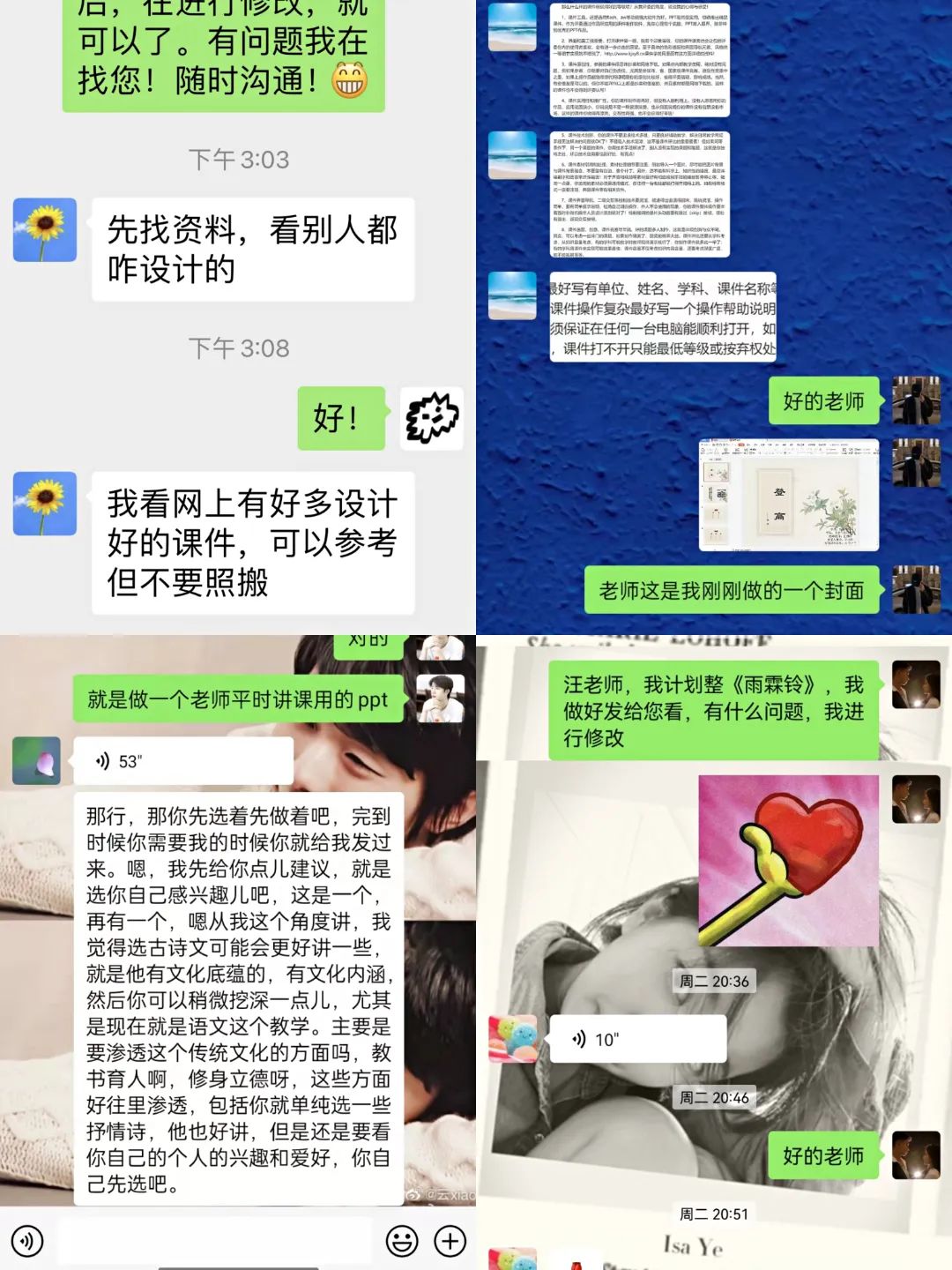 张佐娟老师老师首先要求学生明确本课件要讲什么?要求抓重点,抓中心,抓关键,理清思路,着重分析艺术特色,而且,为了让学生自主思考,张老师秉持“师傅领进门修行在个人”的指导观念,在张老师确定好大方向后,让学生独立思考,自悟自省。徐洁老师深入比赛QQ群,紧跟大赛方向,指导学生扬长避短,做自己所擅长的,在自身强项之处发挥优势,为参赛选手加油打气,树立信心,乐观备赛。王向荣老师对所指导学生以文学鉴赏为例,领悟到语文课之美,同时告诉学生课件大赛是一节无声的语文课,要在课件设计中体现道德人格等综合素质。邓媛媛老师在平日里,就特别平易近人,邓老师对学生们在课件制作中出现的问题亲自指导修改,学生们在邓老师的指导下不仅得到了专业能力的提升,还收获到了一份珍贵的师生情谊。