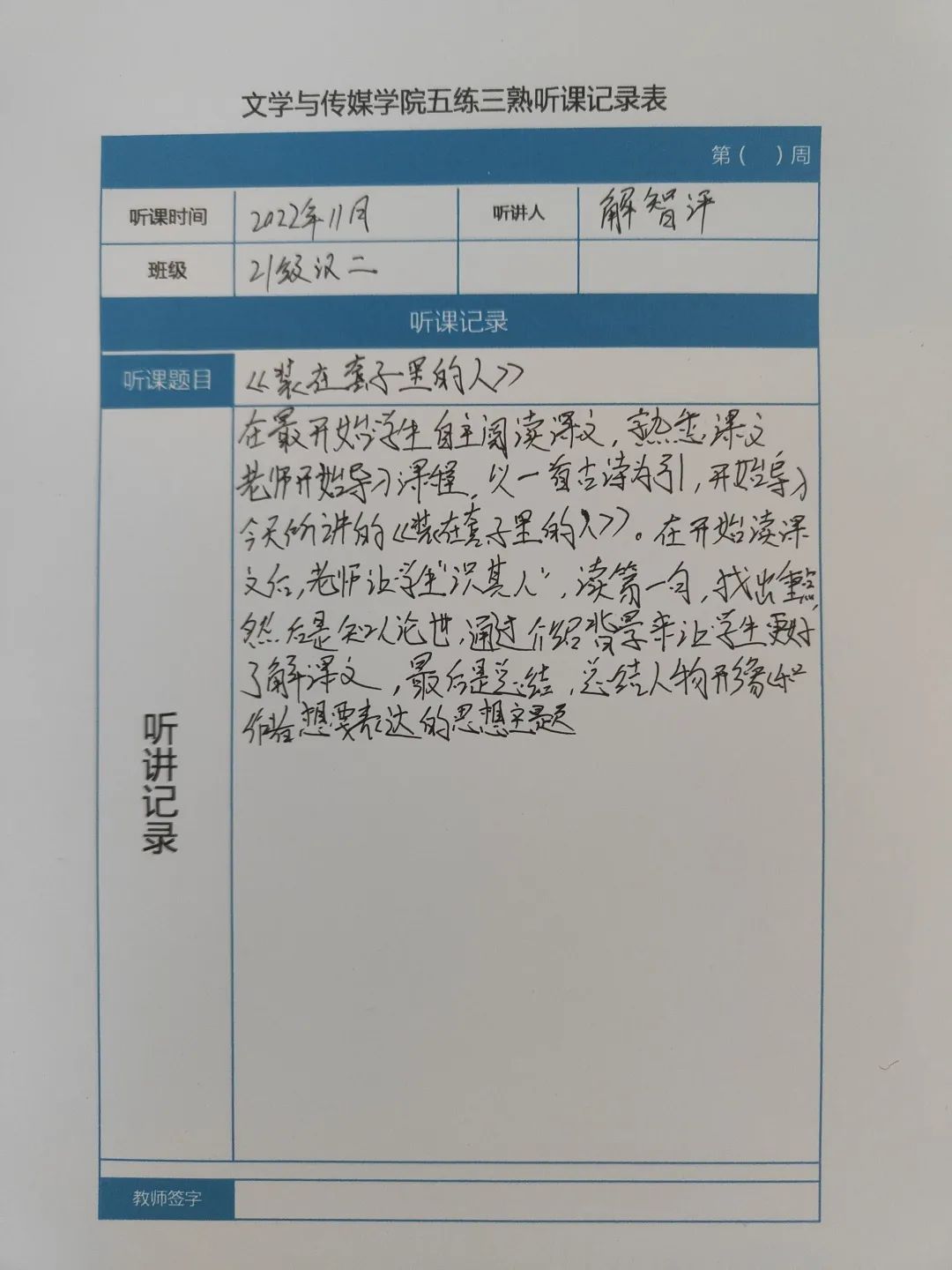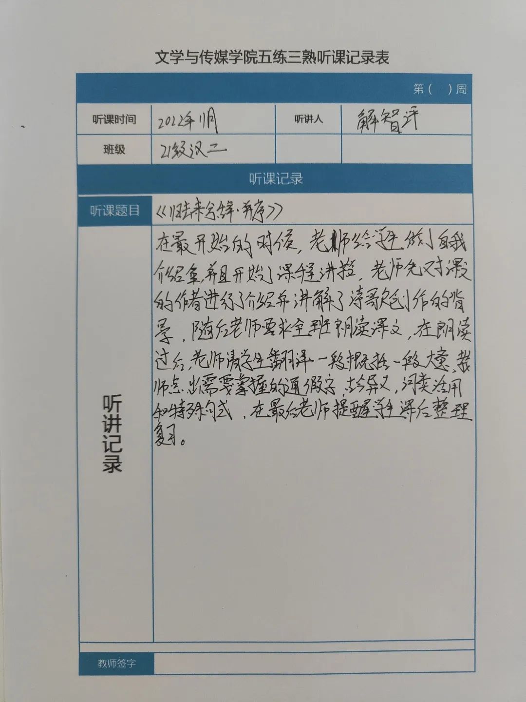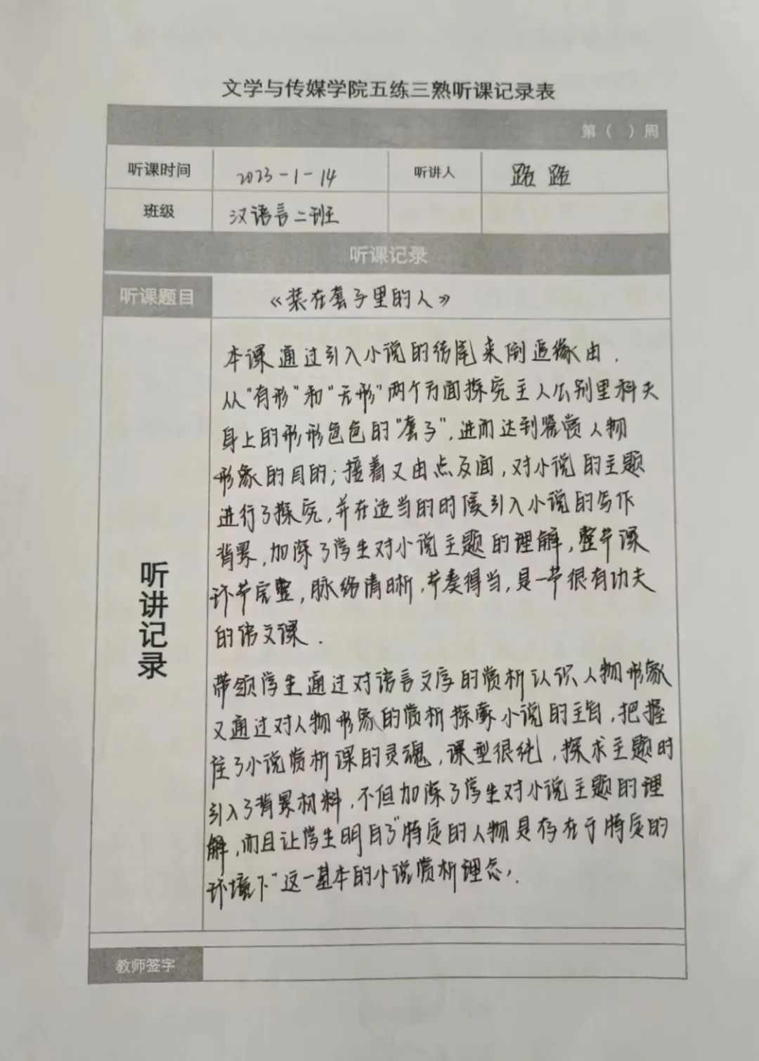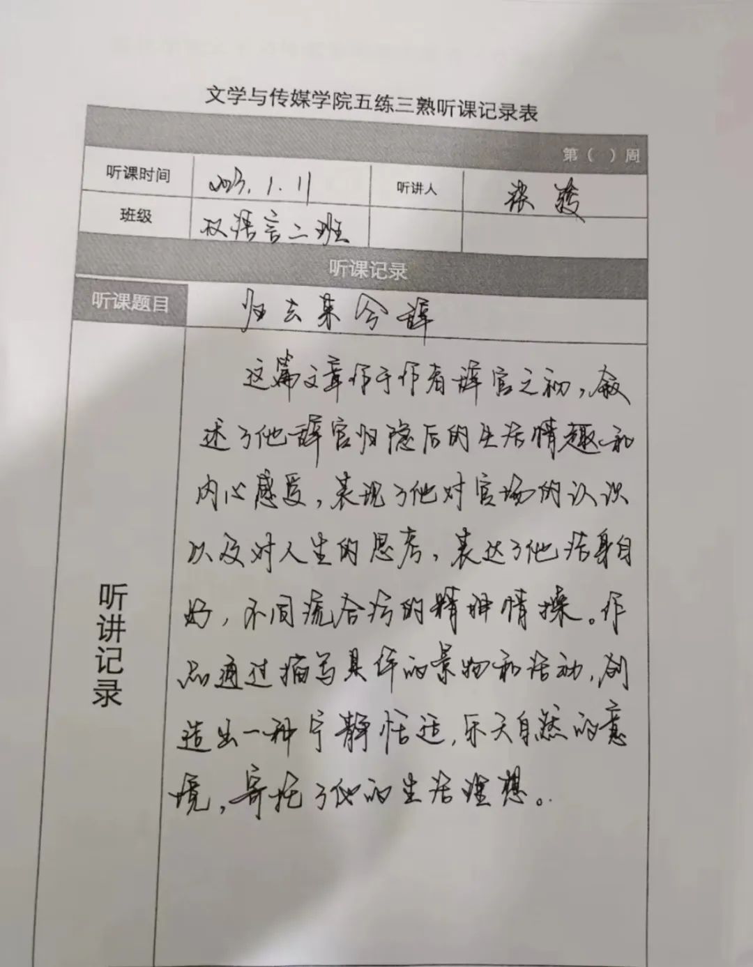 听课记录是听课的第一手资料,是课后进行教学反思交流的材料和依据,更是促进教师专业成长和提高教学水平的极其宝贵财富,为使汉语言专业学生更好的学习专业技能,Beat365中文官方网站特开展听课笔记优秀作品展示活动,让我们一起来看看同学们的听课记录表吧!