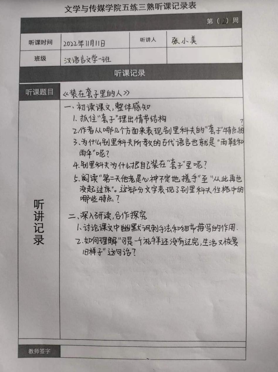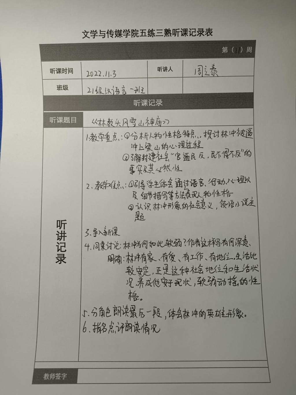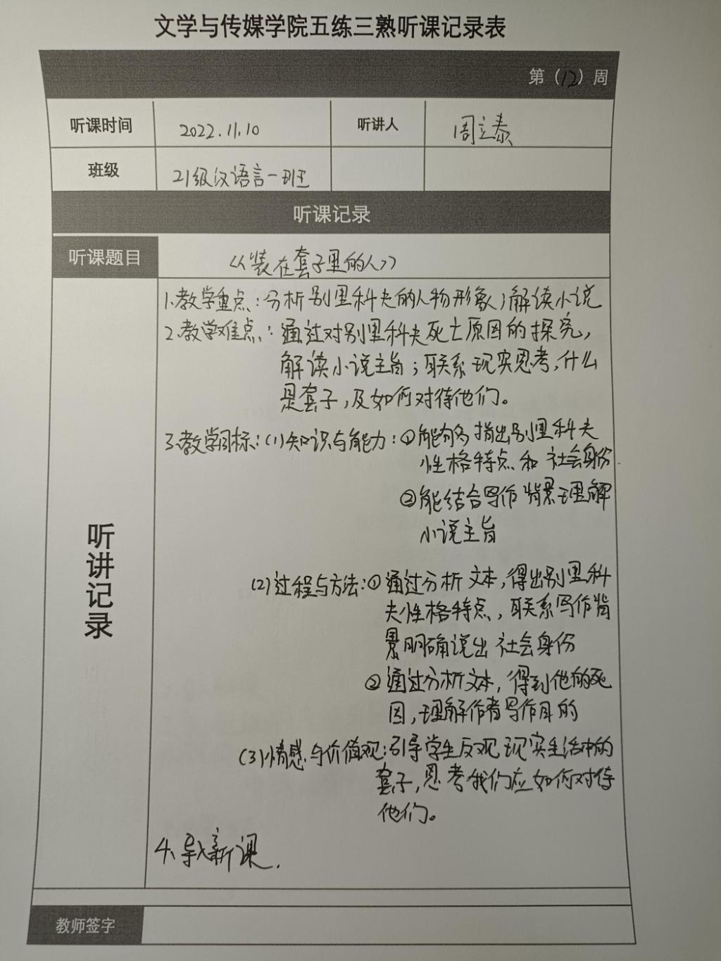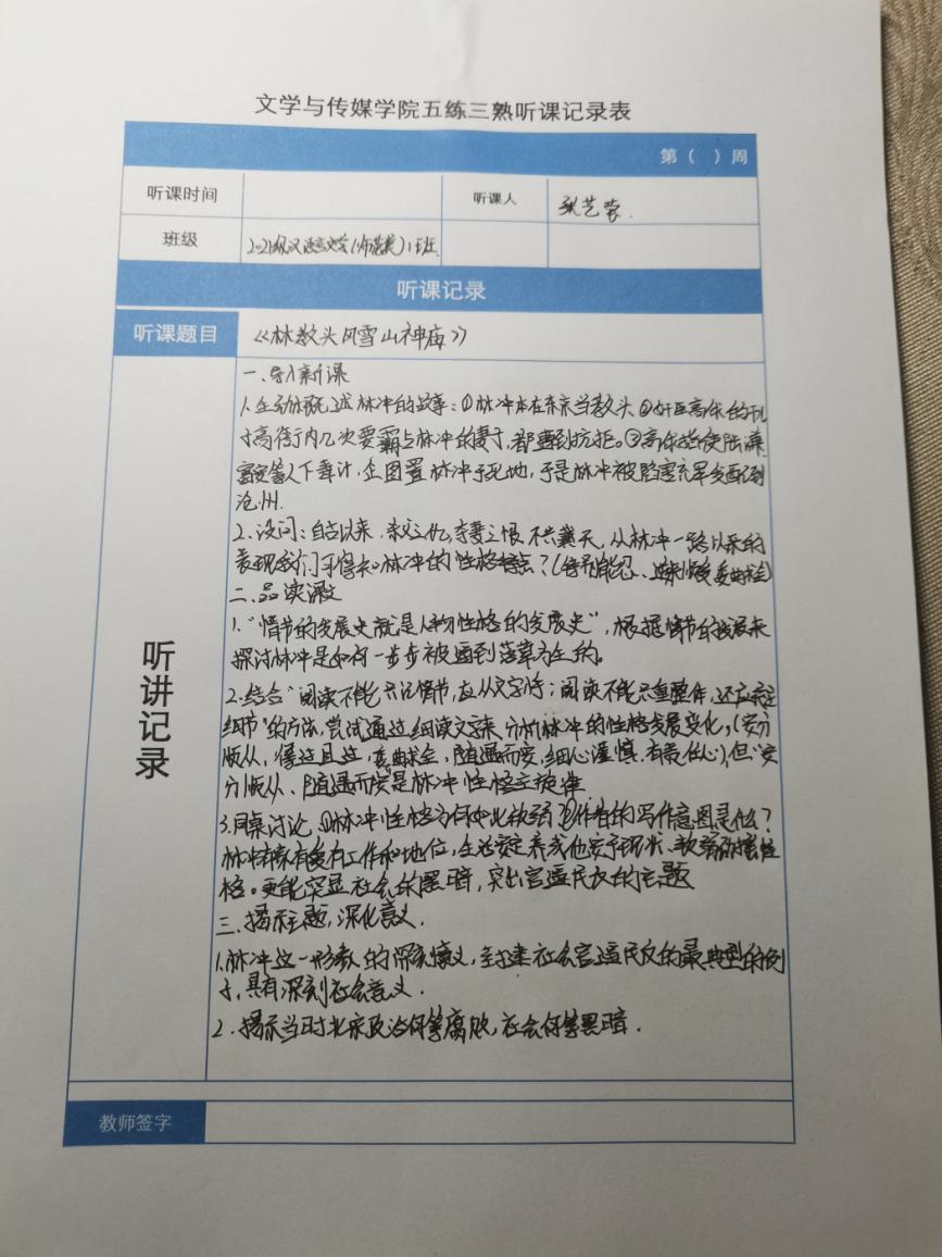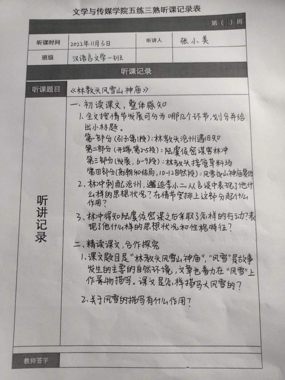 听课记录是听课的第一手资料,是课后进行教学反思交流的材料和依据,更是促进教师专业成长和提高教学水平的极其宝贵财富,为使汉语言专业学生更好的学习专业技能,Beat365中文官方网站特开展听课笔记优秀作品展示活动,让我们一起来看看同学们的听课记录表吧!