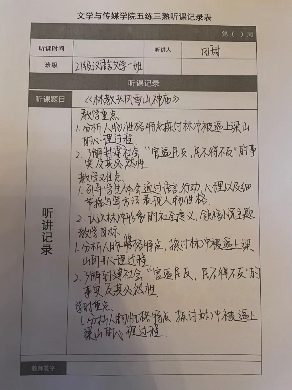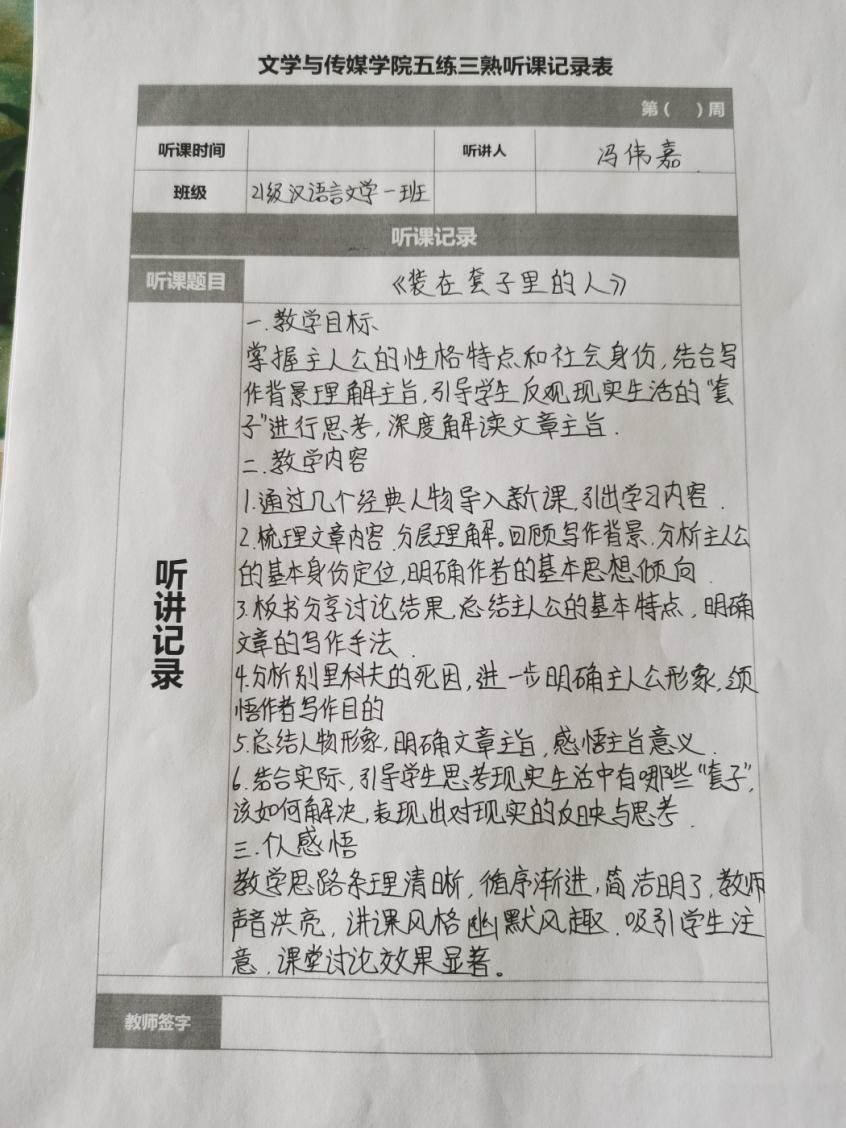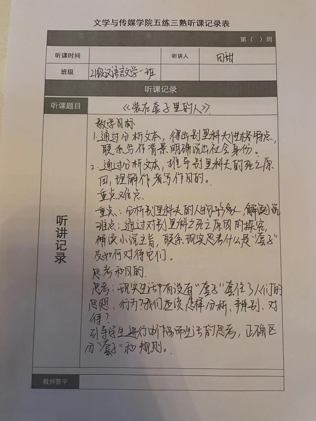 听课记录是听课的第一手资料,是课后进行教学反思交流的材料和依据,更是促进教师专业成长和提高教学水平的极其宝贵财富,为使汉语言专业学生更好的学习专业技能,Beat365中文官方网站特开展听课笔记优秀作品展示活动,让我们一起来看看同学们的听课记录表吧!