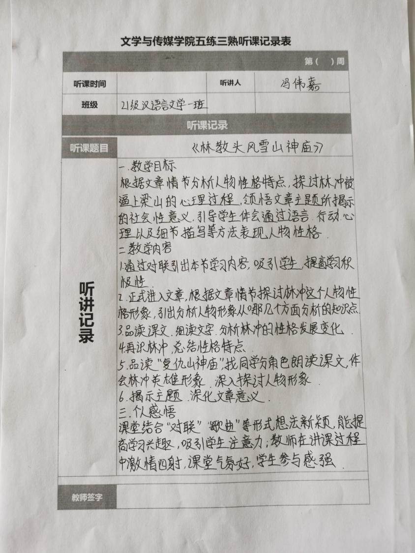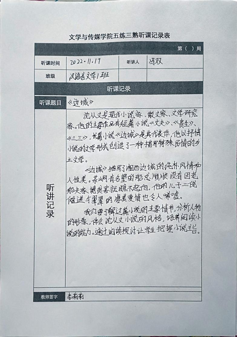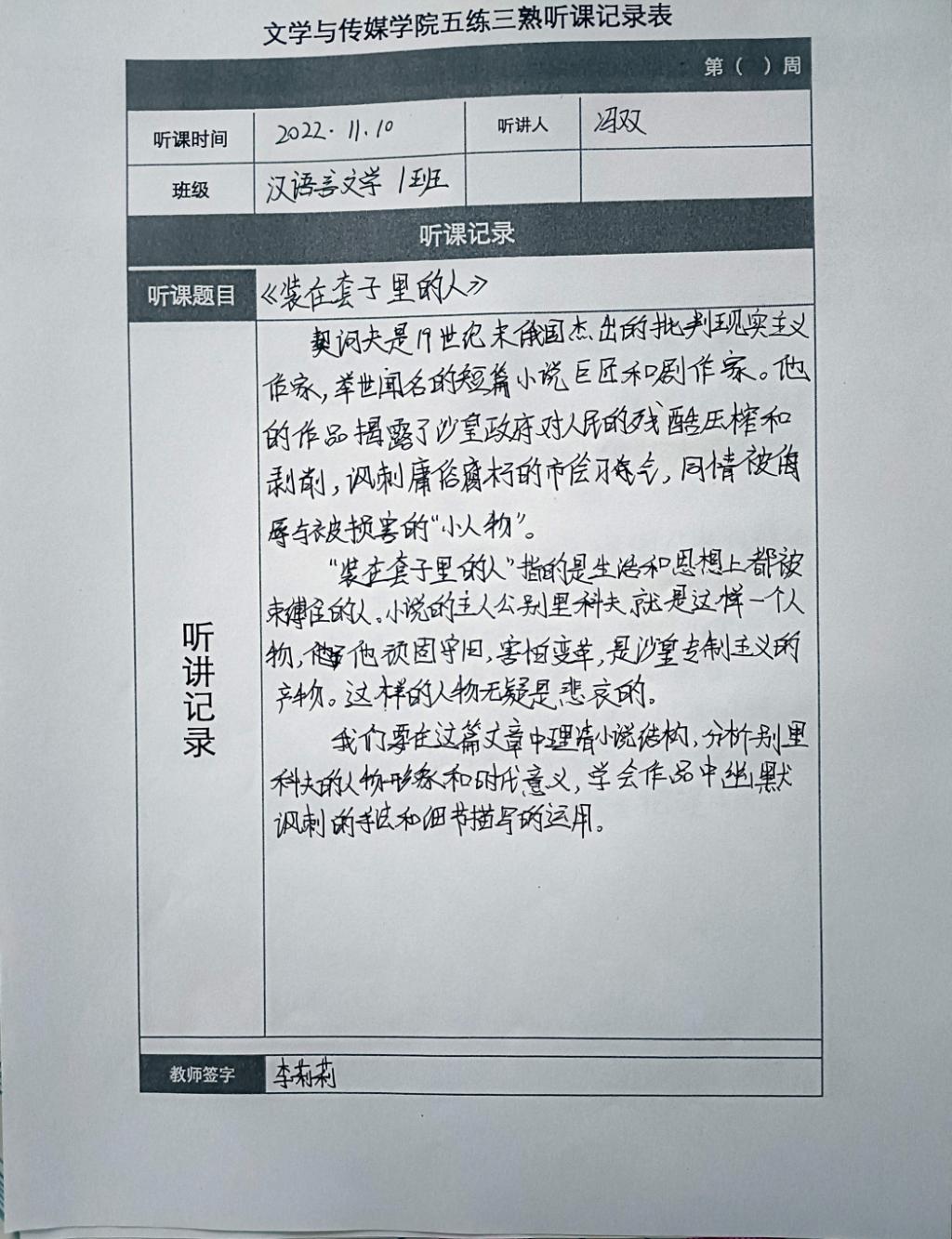 听课记录是听课的第一手资料,是课后进行教学反思交流的材料和依据,更是促进教师专业成长和提高教学水平的极其宝贵财富,为使汉语言专业学生更好的学习专业技能,Beat365中文官方网站特开展听课笔记优秀作品展示活动,让我们一起来看看同学们的听课记录表吧!