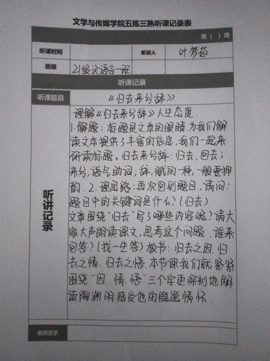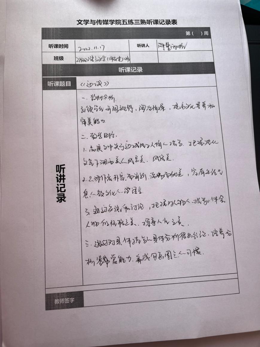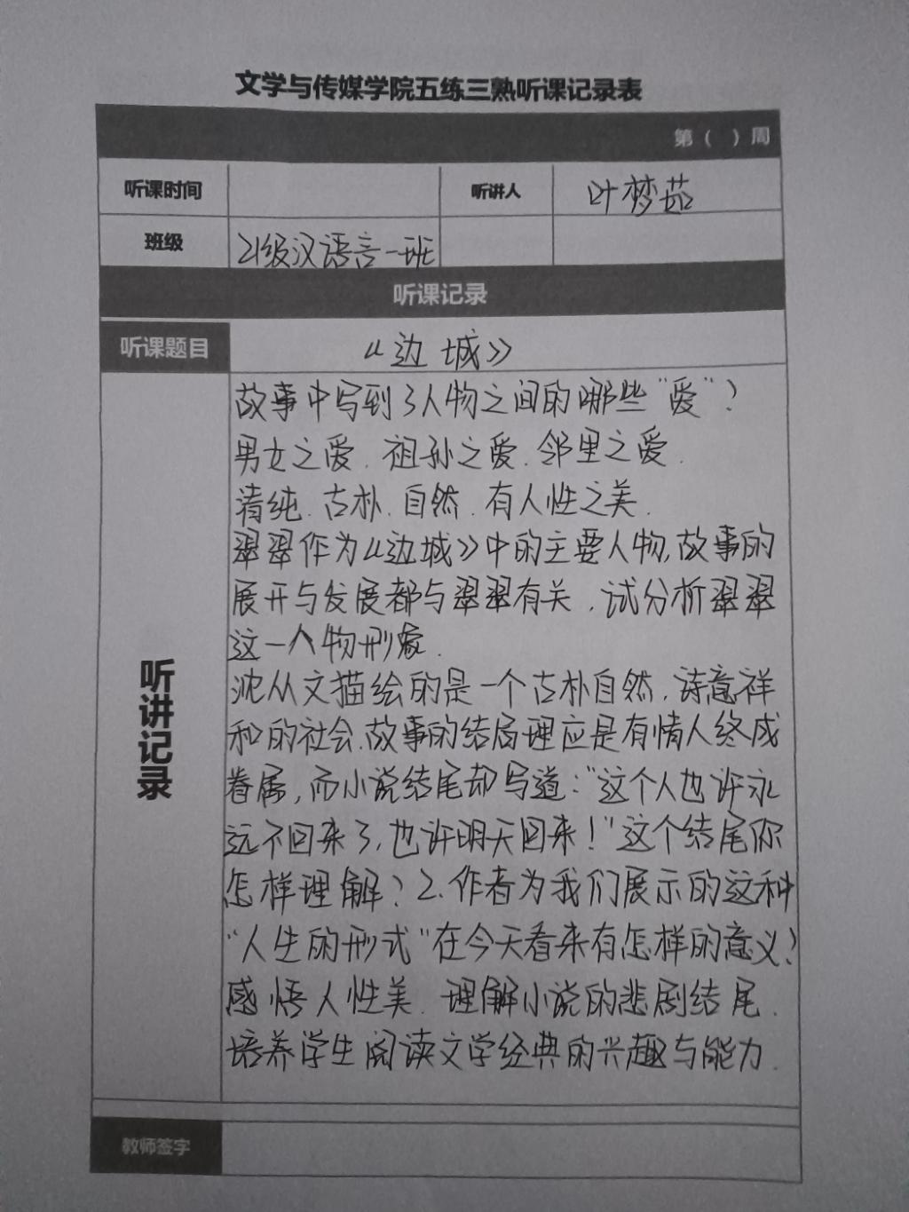 听课记录是听课的第一手资料,是课后进行教学反思交流的材料和依据,更是促进教师专业成长和提高教学水平的极其宝贵财富,为使汉语言专业学生更好的学习专业技能,Beat365中文官方网站特开展听课笔记优秀作品展示活动,让我们一起来看看同学们的听课记录表吧!