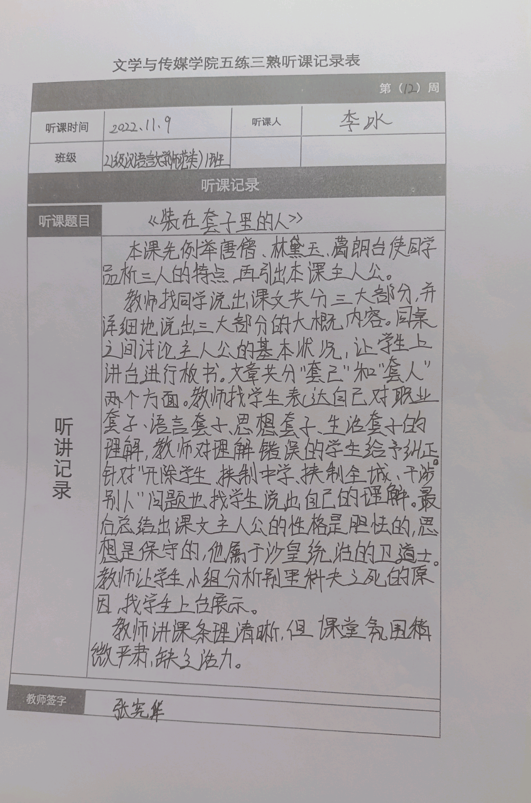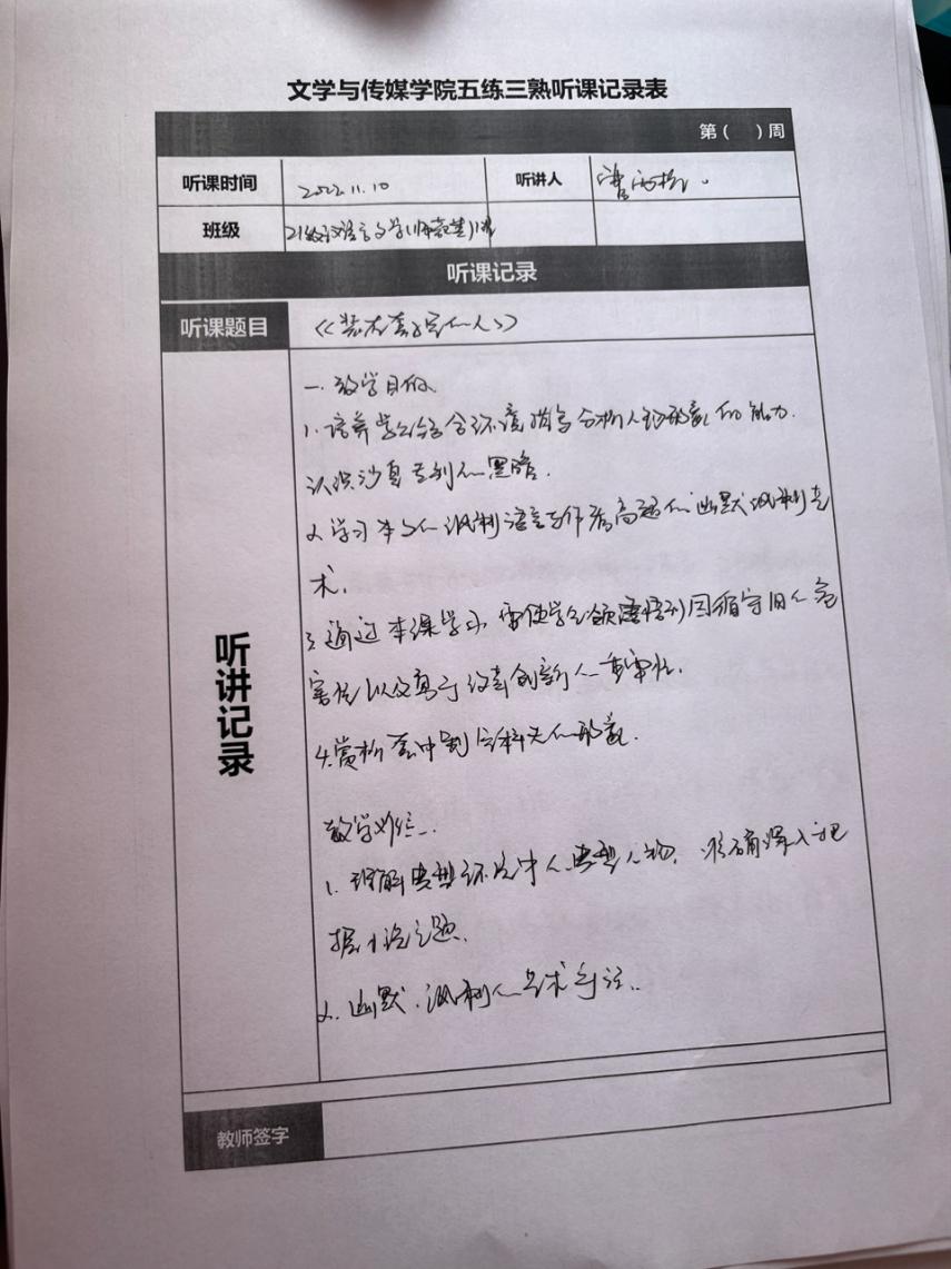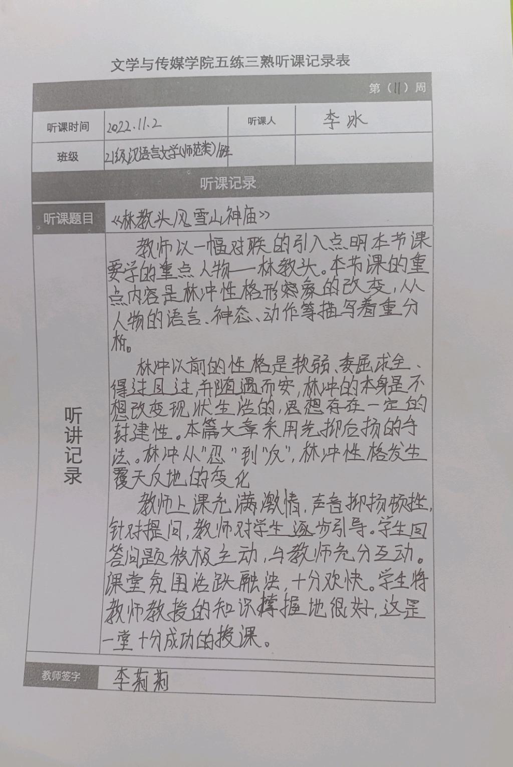 听课记录是听课的第一手资料,是课后进行教学反思交流的材料和依据,更是促进教师专业成长和提高教学水平的极其宝贵财富,为使汉语言专业学生更好的学习专业技能,Beat365中文官方网站特开展听课笔记优秀作品展示活动,让我们一起来看看同学们的听课记录表吧!
