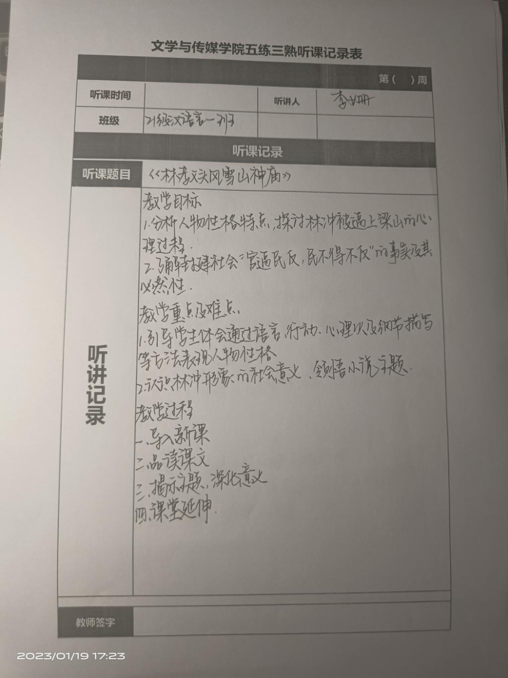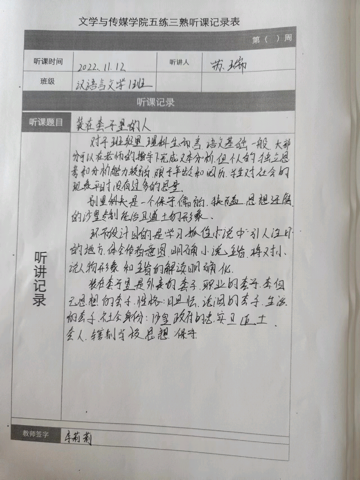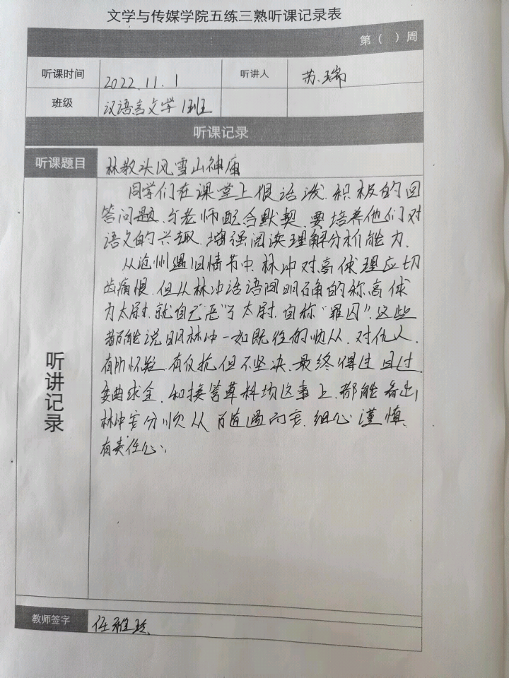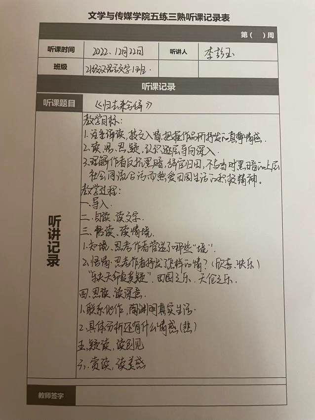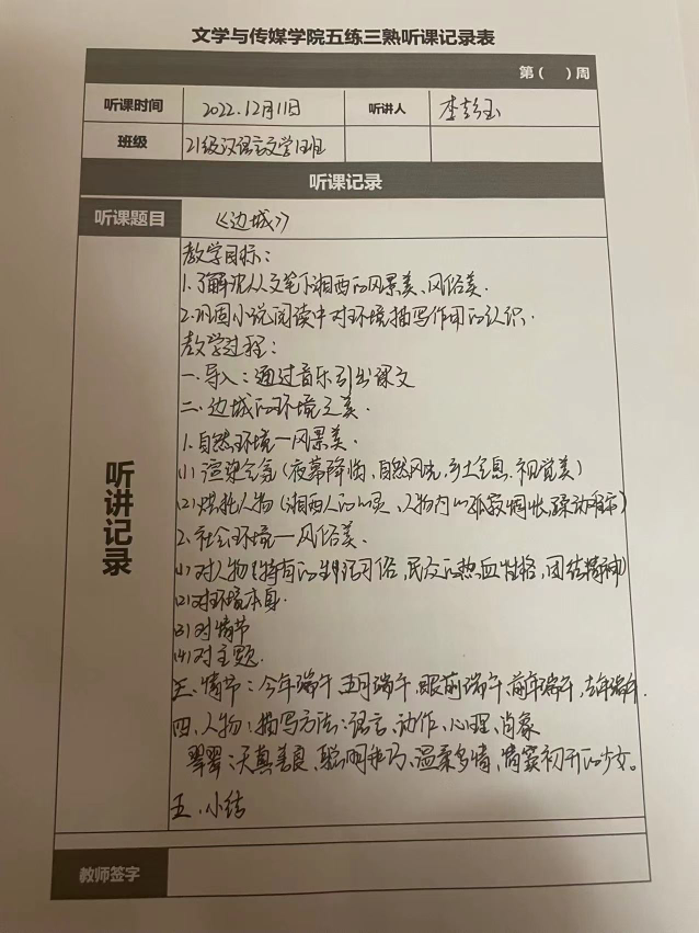 听课记录是听课的第一手资料,是课后进行教学反思交流的材料和依据,更是促进教师专业成长和提高教学水平的极其宝贵财富,为使汉语言专业学生更好的学习专业技能,Beat365中文官方网站特开展听课笔记优秀作品展示活动,让我们一起来看看同学们的听课记录表吧!