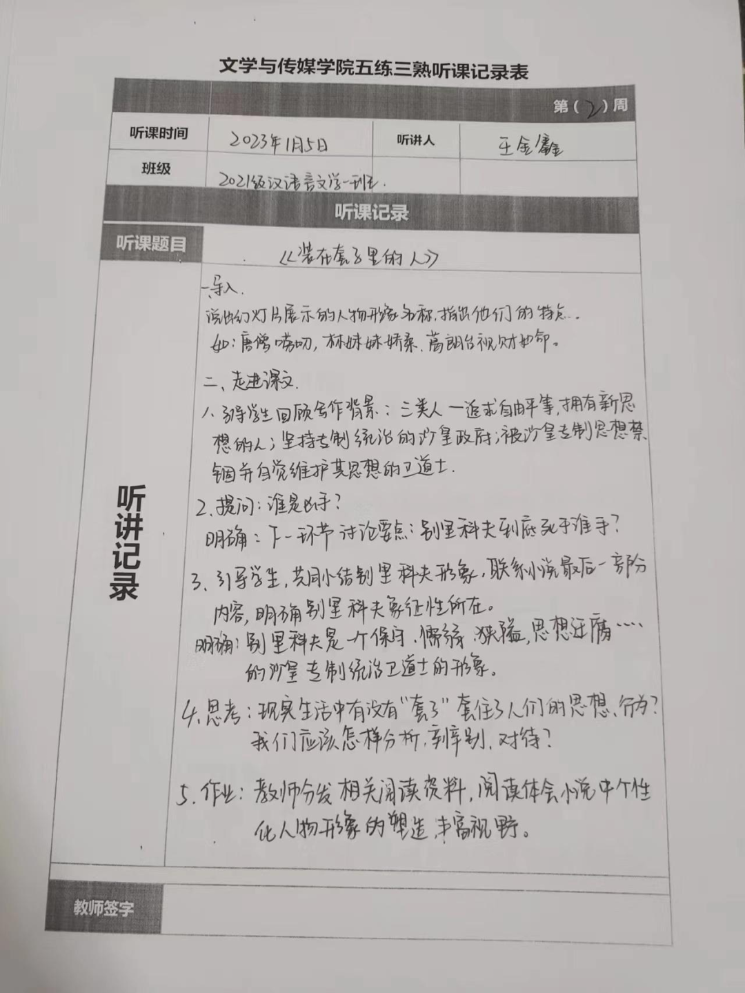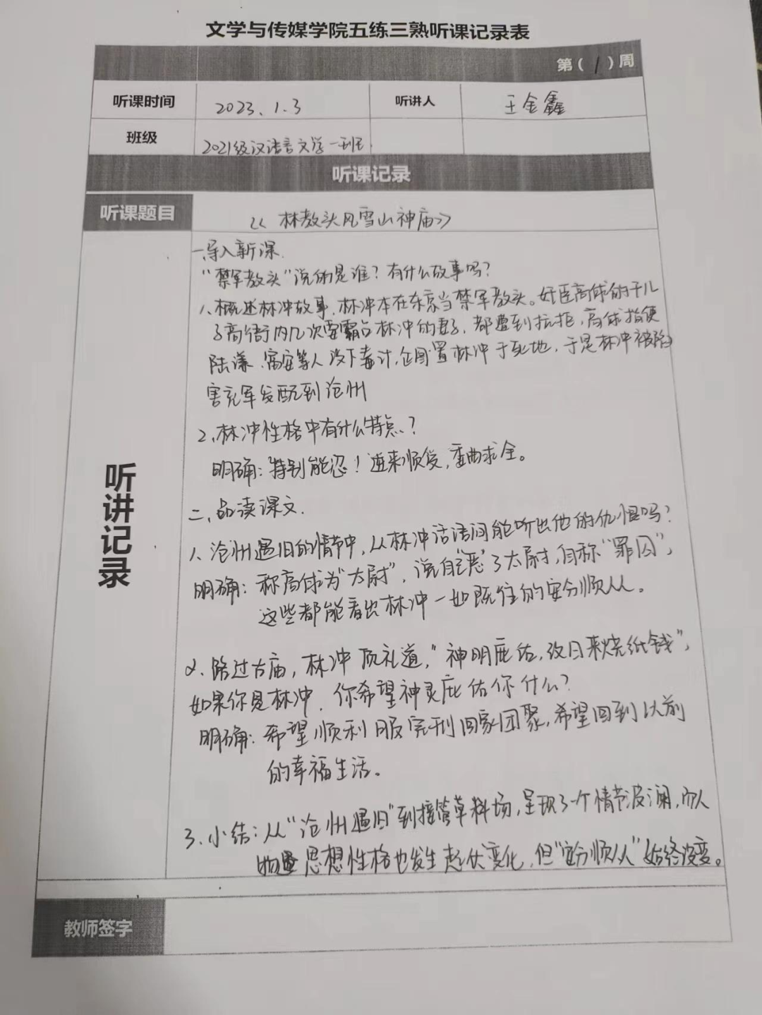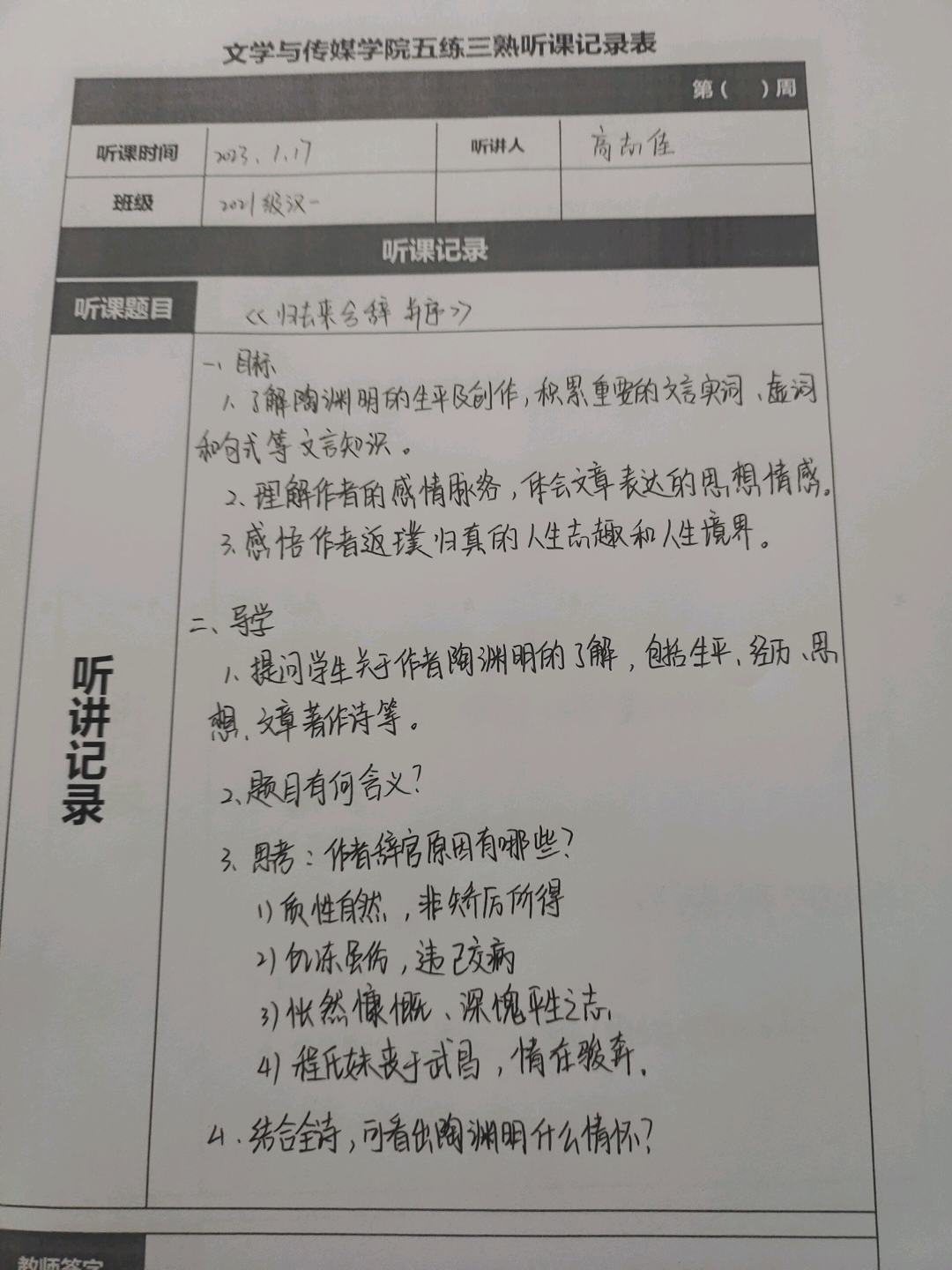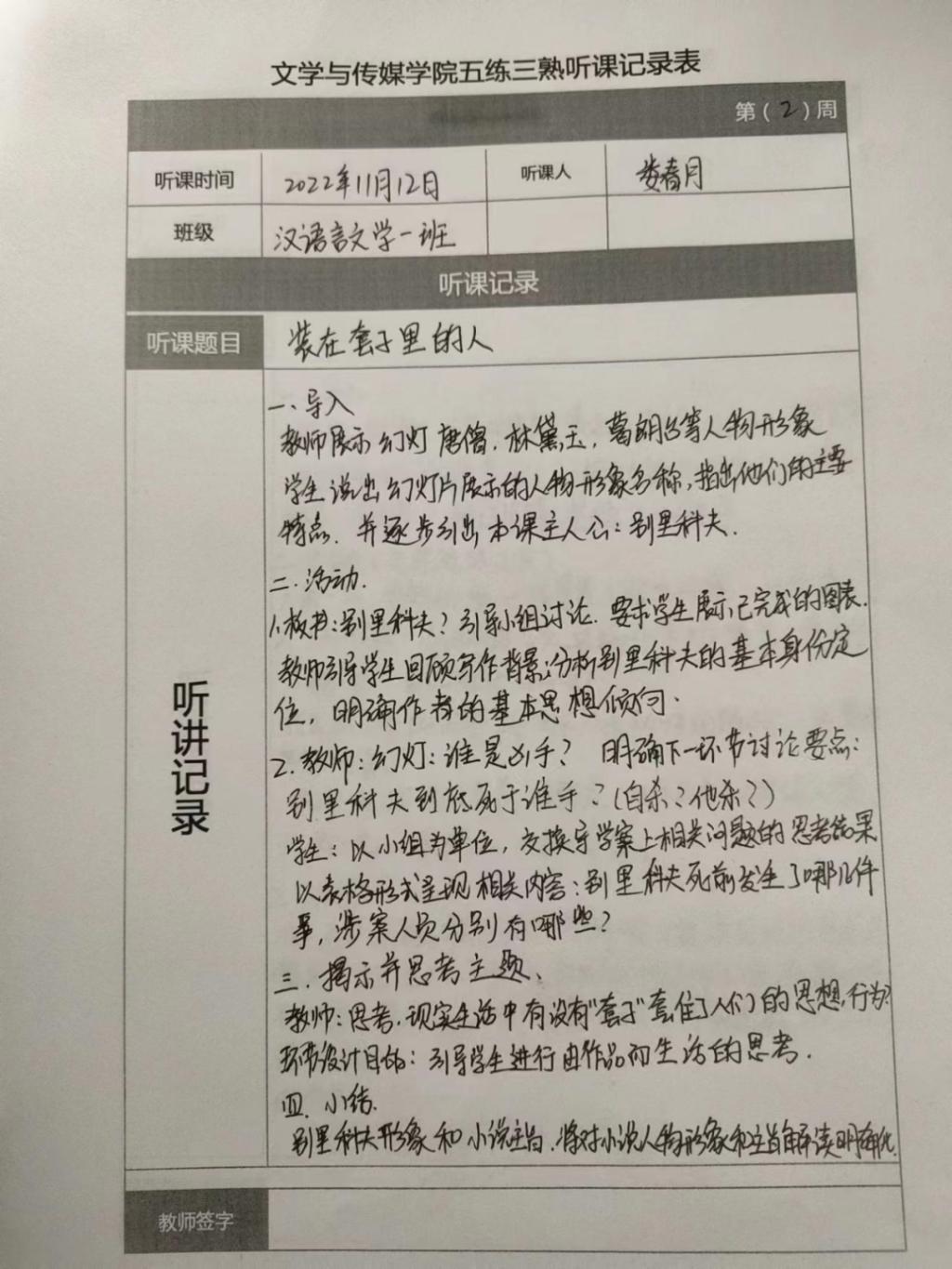 听课记录是听课的第一手资料,是课后进行教学反思交流的材料和依据,更是促进教师专业成长和提高教学水平的极其宝贵财富,为使汉语言专业学生更好的学习专业技能,Beat365中文官方网站特开展听课笔记优秀作品展示活动,让我们一起来看看同学们的听课记录表吧!