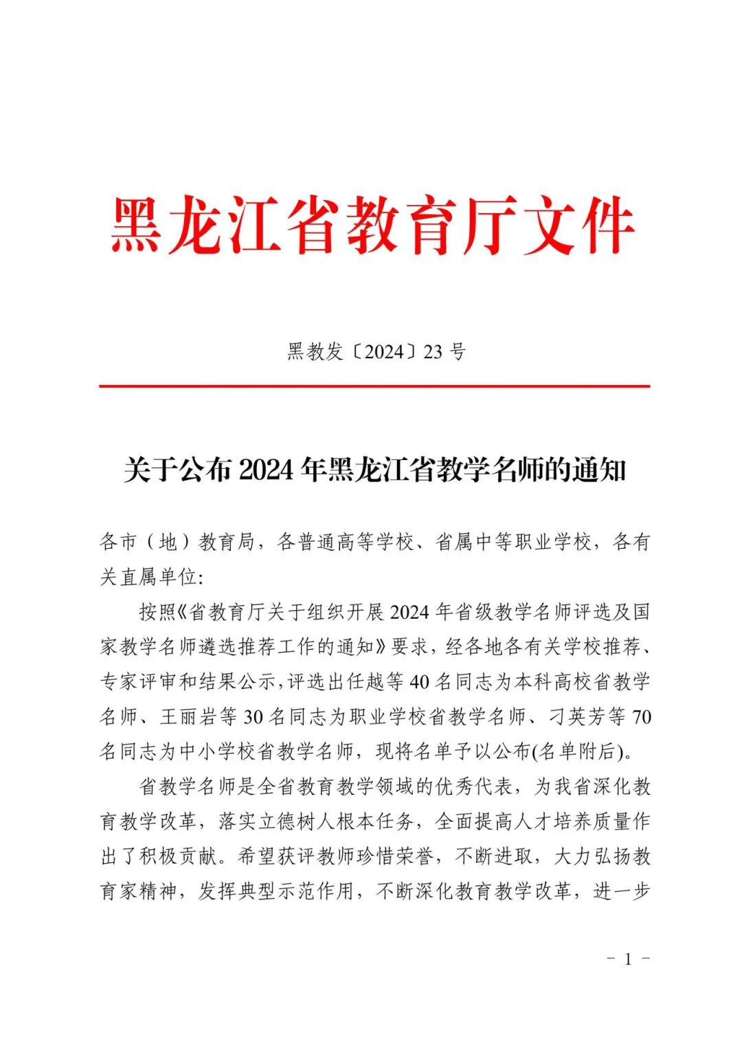 4月3日,省教育厅下发通知,公布了2024年黑龙江省教学名师评选结果,Beat365官网Beat365中文官方网站由婧涵教授获评黑龙江省教学名师。