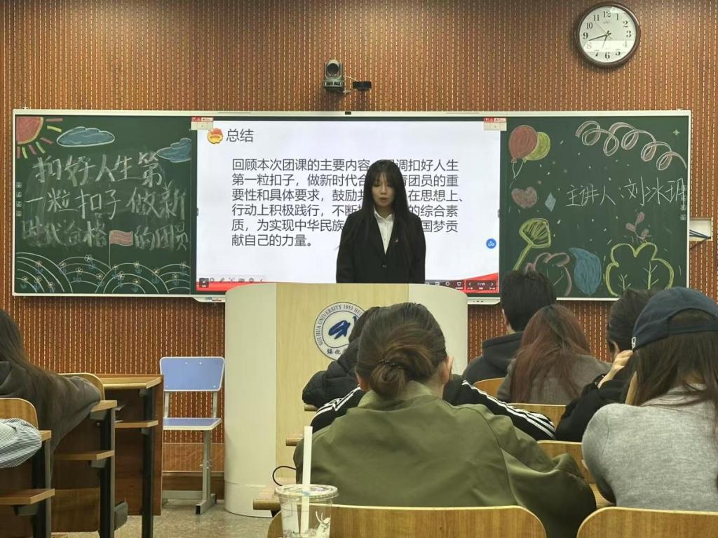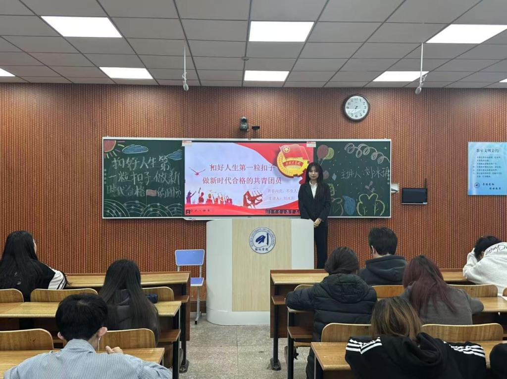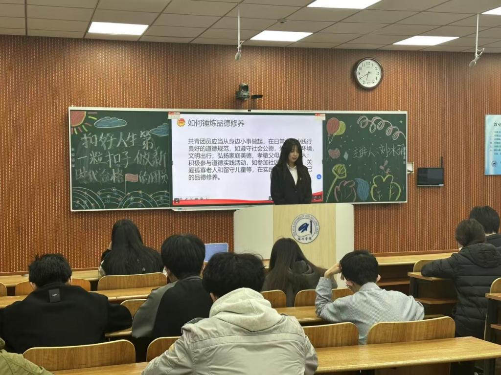 刘冰玥通过分享优秀团员青年的先进事迹,号召同学们以榜样为镜,在日常学习生活中践行“扣好扣子”的理念。她强调,新时代青年应珍惜机遇,主动投身志愿服务、科技创新等实践,以实际行动诠释“请党放心,强国有我”的誓言。同时,她鼓励大家以团章为行动指南,始终保持昂扬向上的精神风貌,在实现中华民族伟大复兴的征程中书写无悔青春。