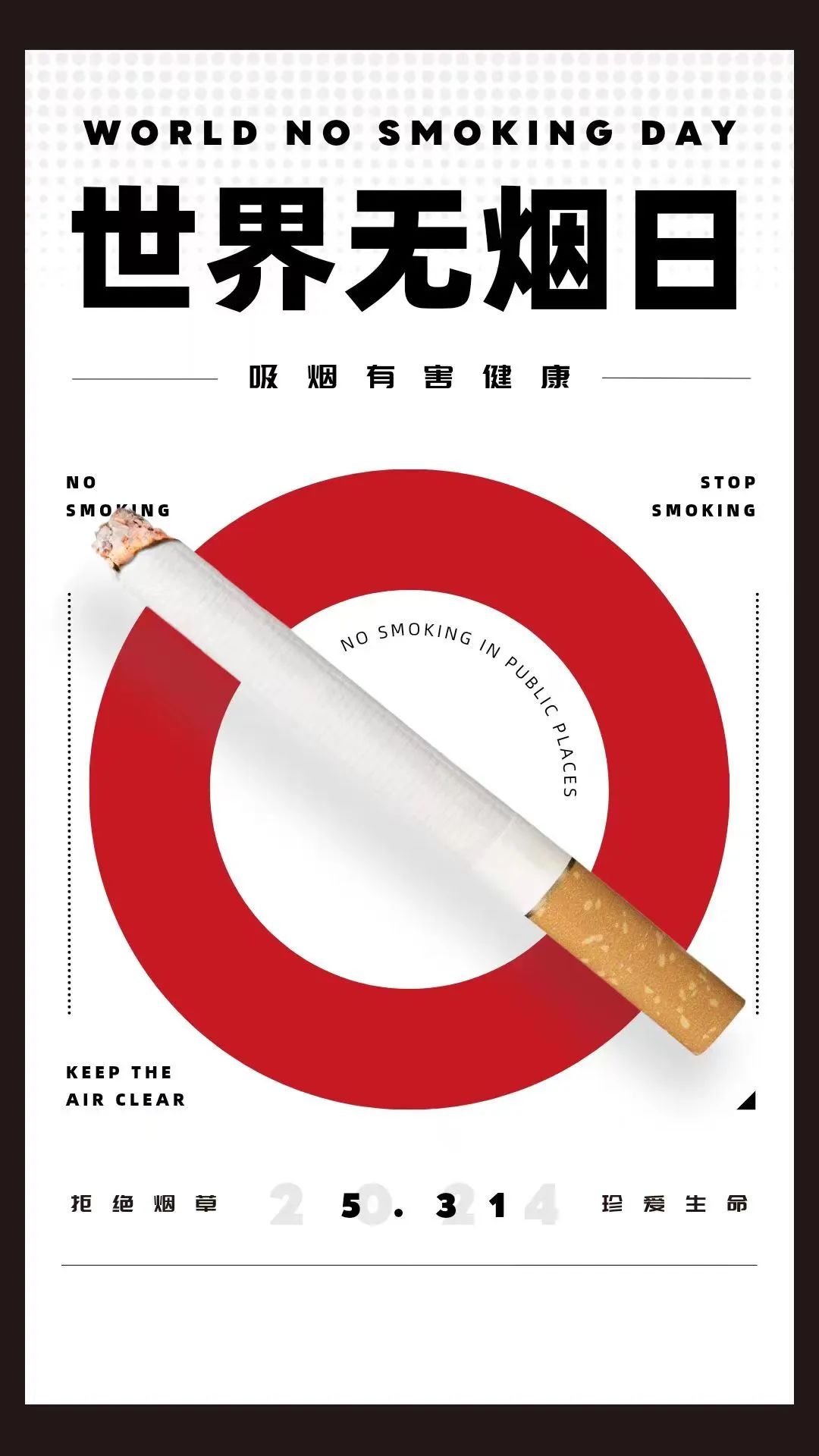 世界无烟日珍爱生命,拒绝吸烟。